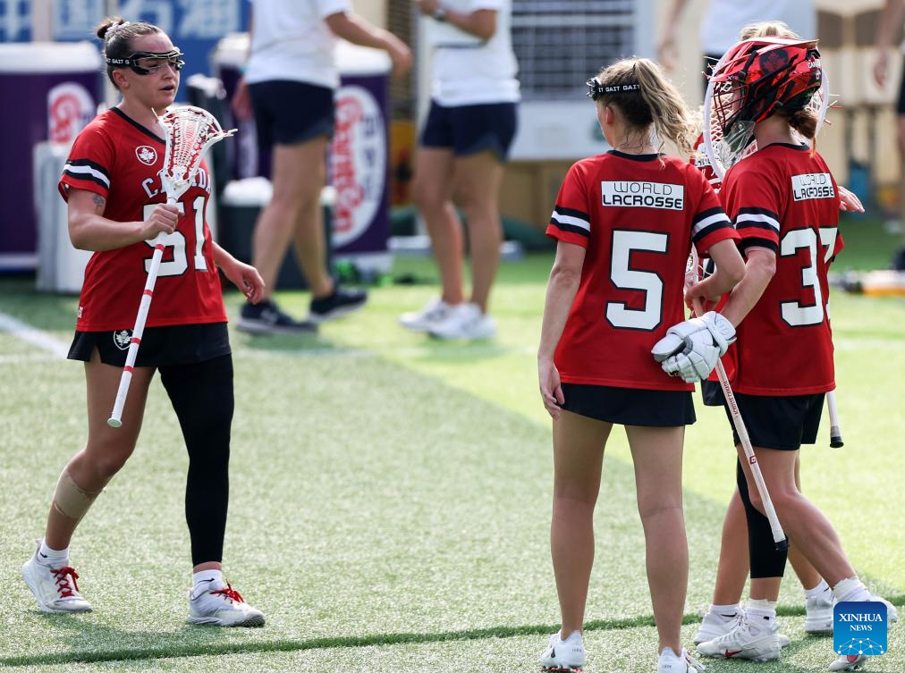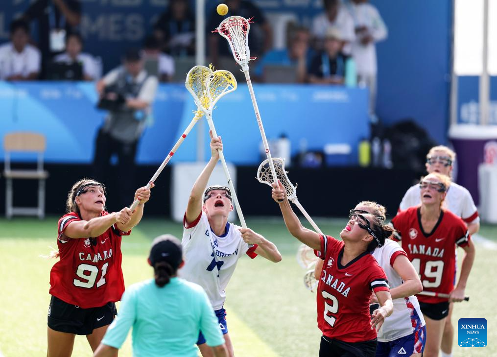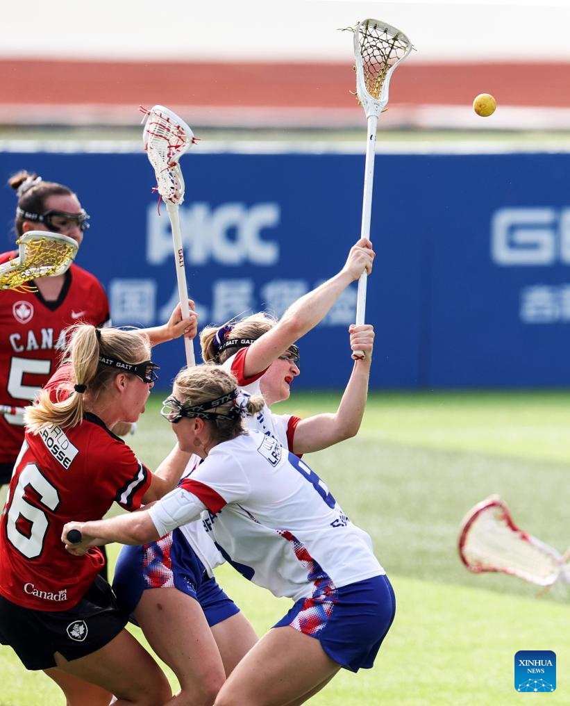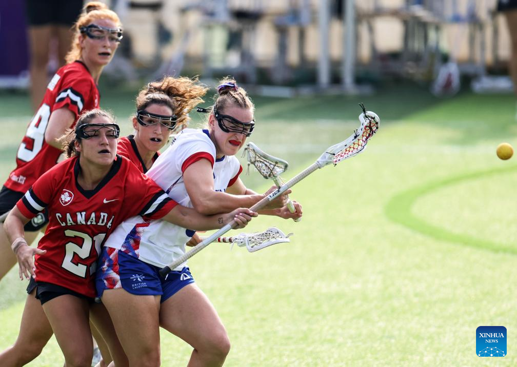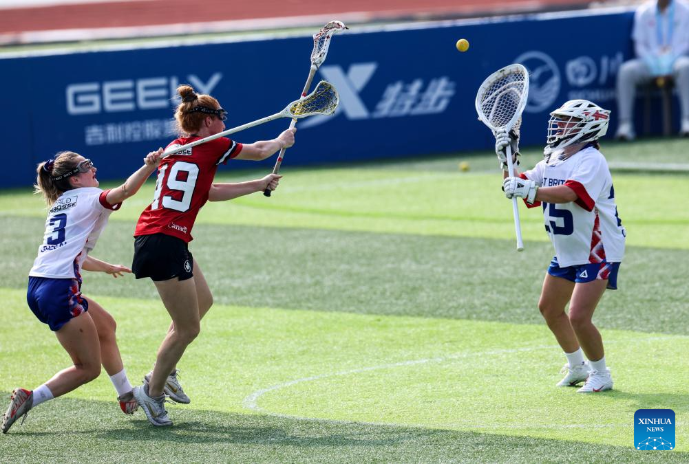Jordan Dean (C) of Canada competes with Liv Wimpenny (R) of Britain during the women's preliminary round Group A match between Britain and Canada of Lacrosse event at the World Games 2025 in Chengdu, southwest China's Sichuan Province, Aug. 8, 2025. (Xinhua/Chen Bin)