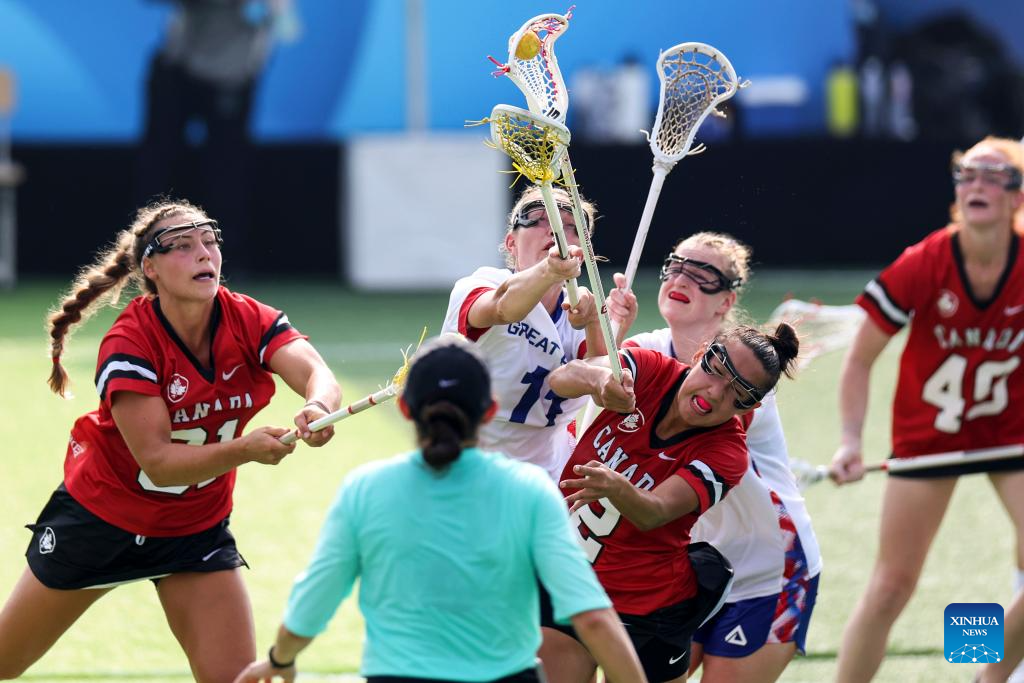 Jordan Dean (1st L) and Lauren Black (4th R)of Canada compete with Liv Wimpenny (3rd L) of Britain during the women's preliminary round Group A match between Britain and Canada of Lacrosse event at the World Games 2025 in Chengdu, southwest China's Sichuan Province, Aug. 8, 2025. (Xinhua/Chen Bin)