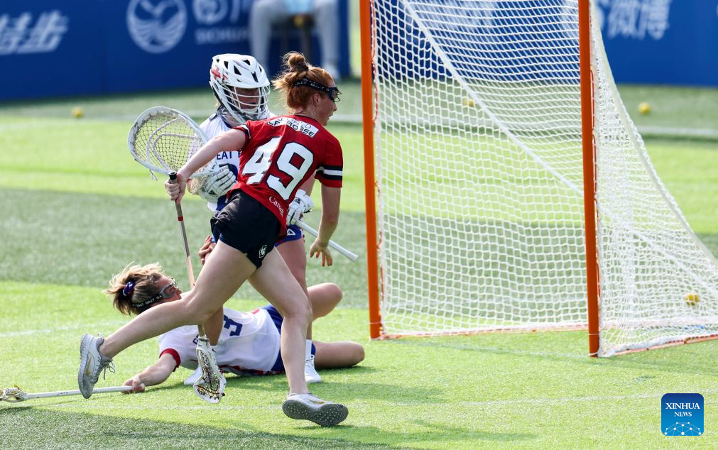 Maddy Baxter (front) of Canada scores during the women's preliminary round Group A match between Britain and Canada of Lacrosse event at the World Games 2025 in Chengdu, southwest China's Sichuan Province, Aug. 8, 2025. (Xinhua/Chen Bin)
