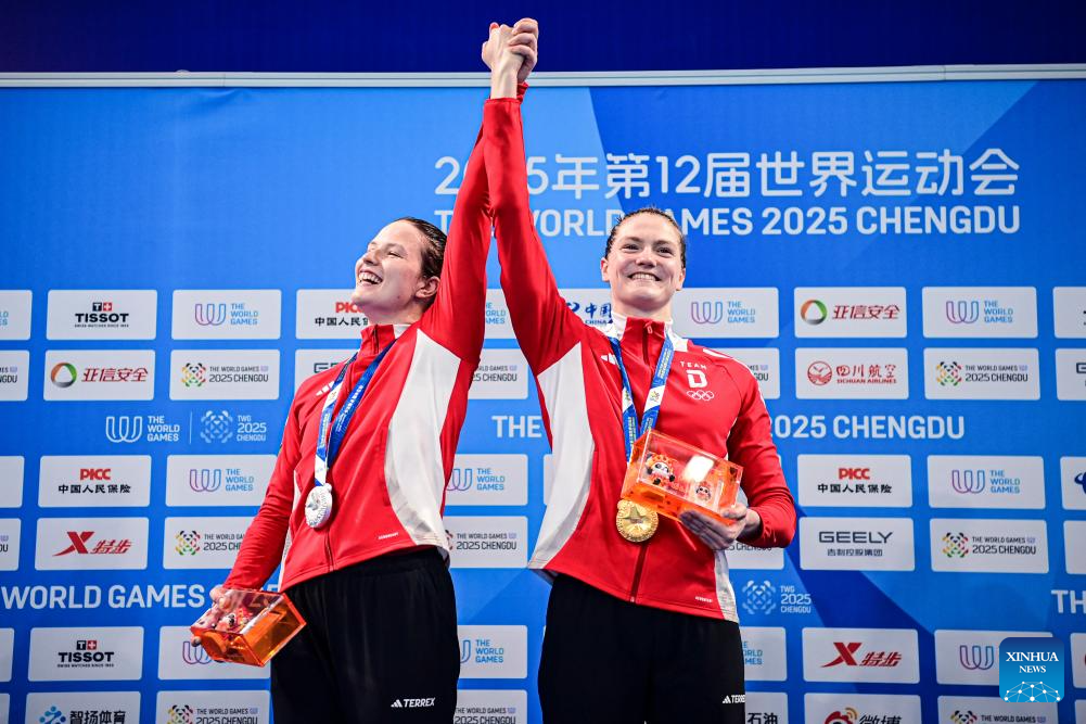 Gold medalist Nina Holt (R) of Germany and silver medalist Lena Oppermann of Germany celebrate during the victory ceremony for the women's 100m rescue medley final match of Life Saving event at the World Games 2025 in Chengdu, southwest China's Sichuan Province, Aug. 8, 2025. (Xinhua/Zhang Liyun)