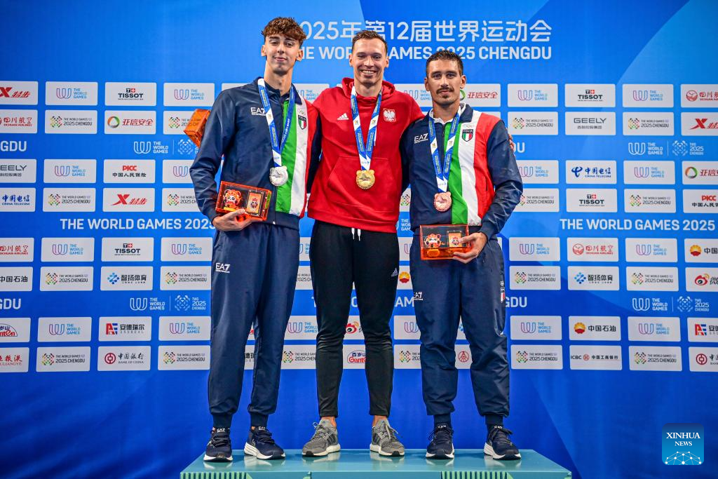 Gold medalist Kacper Majchrzak (C) of Poland, silver medalist Simone Locchi (L) of Italy and bronze medalist Francesco Ippolito of Italy pose during the victory ceremony for the men's 100m rescue medley final match of Life Saving event at the World Games 2025 in Chengdu, southwest China's Sichuan Province, Aug. 8, 2025. (Xinhua/Jiang Han)