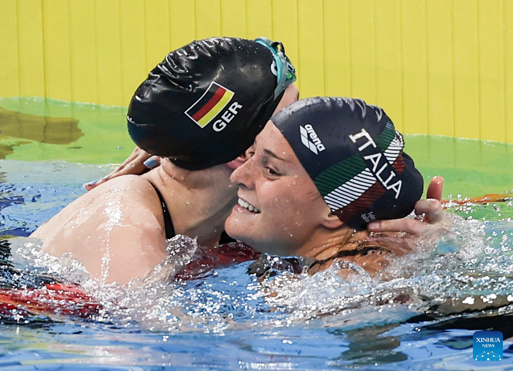 Nina Holt (L) of Germany hugs Anna Pirovano of Italy after the women's 100m rescue medley final match of Life Saving event at the World Games 2025 in Chengdu, southwest China's Sichuan Province, Aug. 8, 2025. (Xinhua/Zhang Liyun)