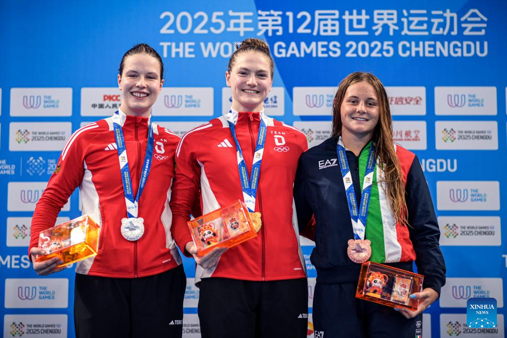 Gold medalist Nina Holt (C) of Germany, silver medalist Lena Oppermann (L) of Germany and bronze medalist Helene Giovanelli of Italy pose during the victory ceremony for the women's 100m rescue medley final match of Life Saving event at the World Games 2025 in Chengdu, southwest China's Sichuan Province, Aug. 8, 2025. (Xinhua/Jiang Han)