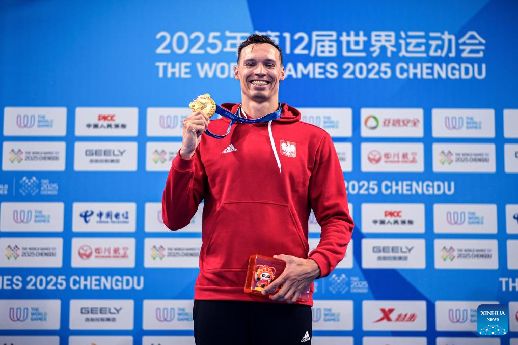 Gold medalist Kacper Majchrzak of Poland poses during the victory ceremony for the men's 100m rescue medley final match of Life Saving event at the World Games 2025 in Chengdu, southwest China's Sichuan Province, Aug. 8, 2025. (Xinhua/Jiang Han)