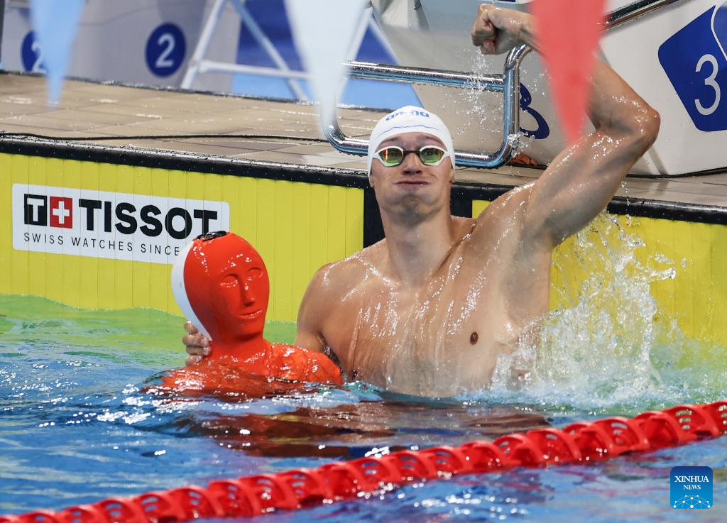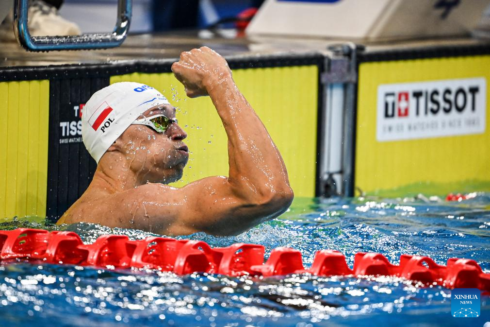 Kacper Majchrzak of Poland celebrates after the men's 100m rescue medley final match of Life Saving event at the World Games 2025 in Chengdu, southwest China's Sichuan Province, Aug. 8, 2025. (Xinhua/Zhang Liyun)