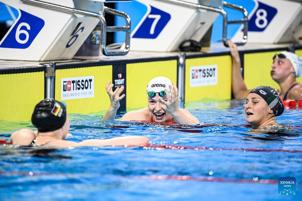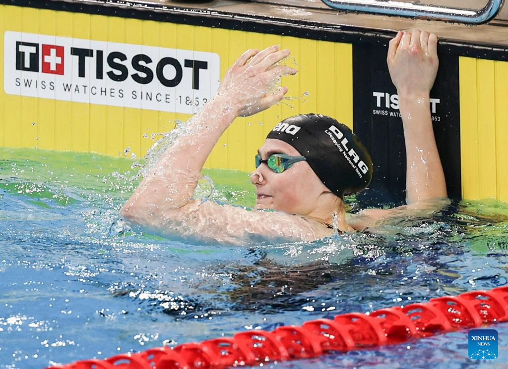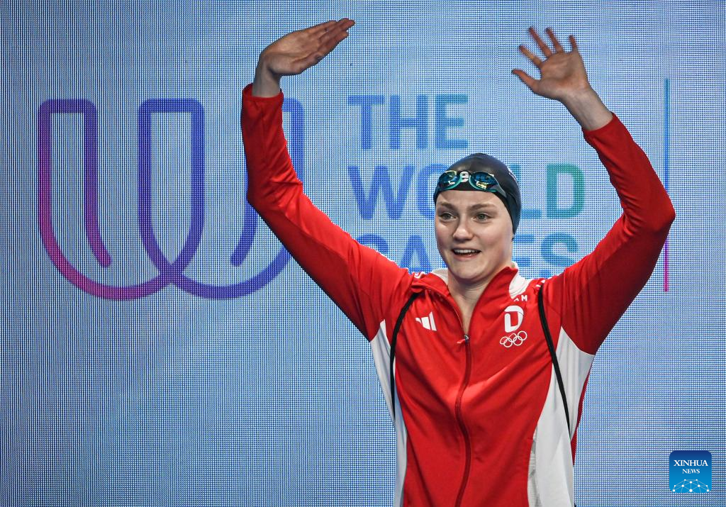 Nina Holt of Germany celebrates after the women's 100m rescue medley final match of Life Saving event at the World Games 2025 in Chengdu, southwest China's Sichuan Province, Aug. 8, 2025. (Xinhua/Zhang Liyun)
