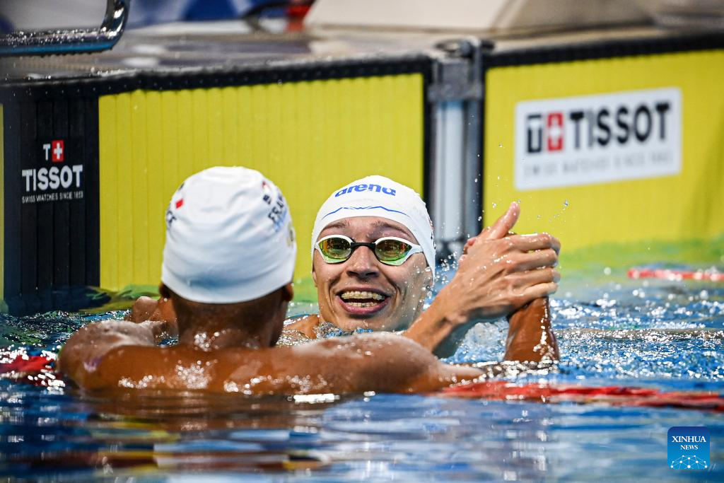 Kacper Majchrzak (R) of Poland celebrates with Goroco Koindredi of France after the men's 100m rescue medley final match of Life Saving event at the World Games 2025 in Chengdu, southwest China's Sichuan Province, Aug. 8, 2025. (Xinhua/Jiang Han)