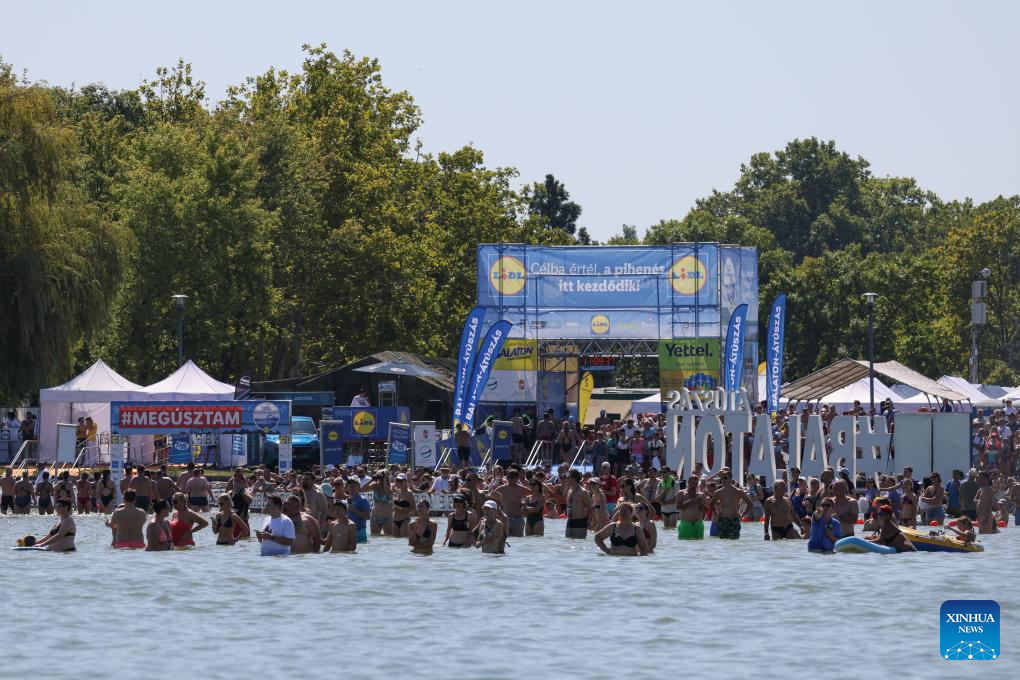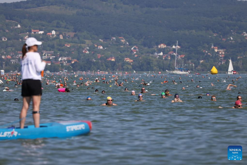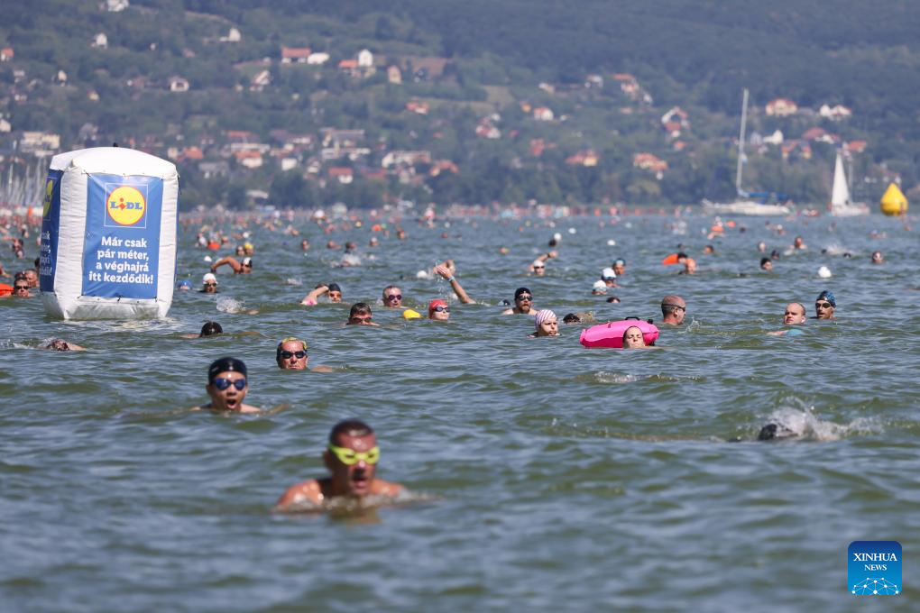 People participate in the Lake Balaton Cross Swimming event held on Lake Balaton between Revfulop and Balatonboglar, Hungary, Aug. 9, 2025. (Photo by Attila Volgyi/Xinhua)