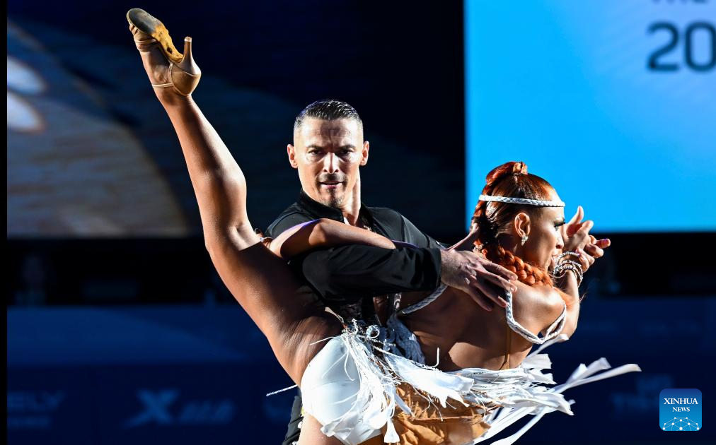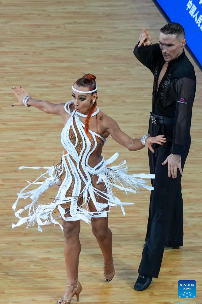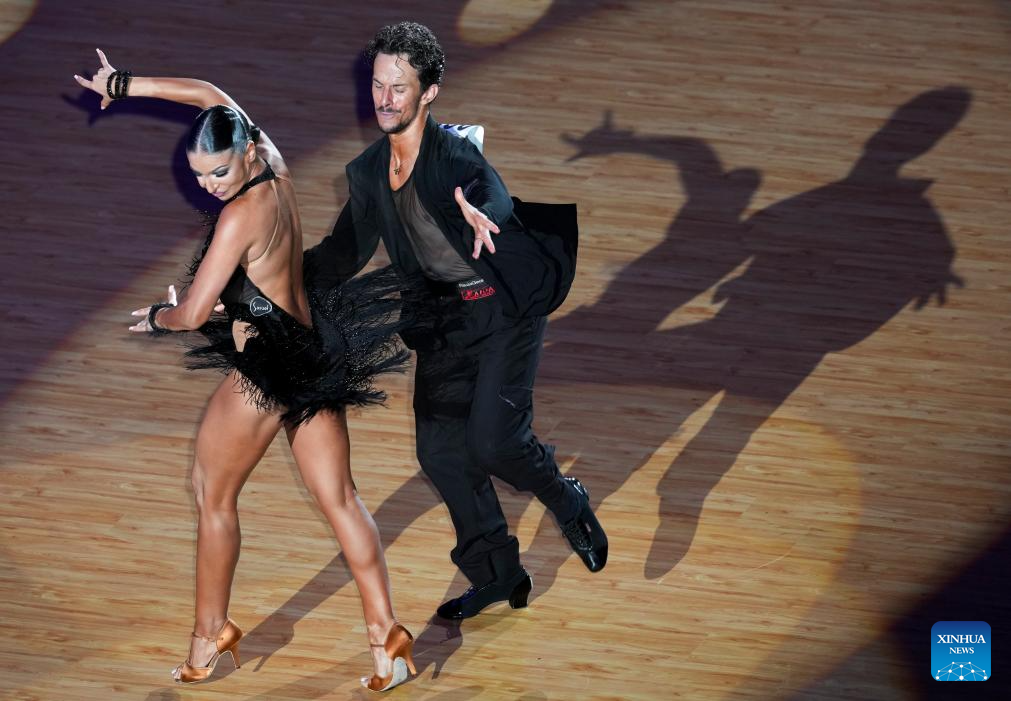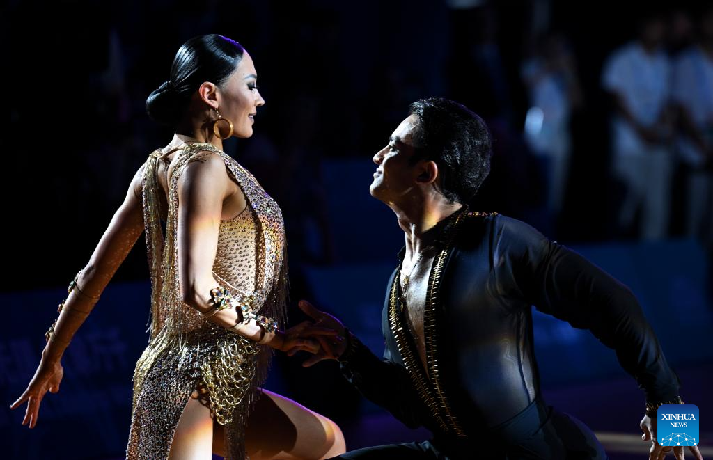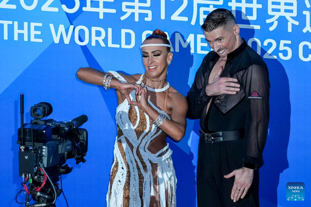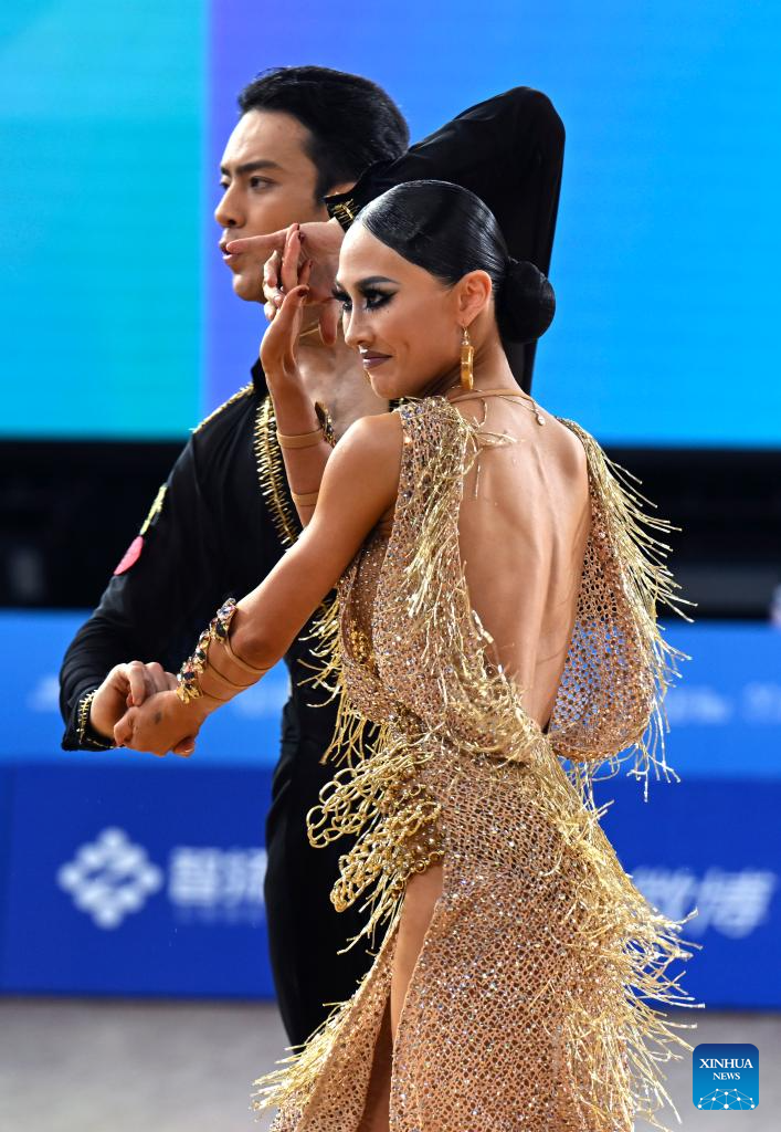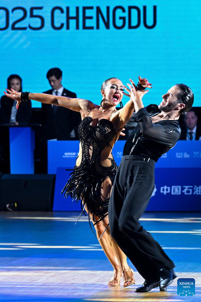 Marius Balan/Khrystyna Moshenska (R) of Germany compete during the Latin final match of Dancesport event at the World Games 2025 in Chengdu, southwest China's Sichuan Province, Aug. 8, 2025. (Xinhua/Du Zixuan)