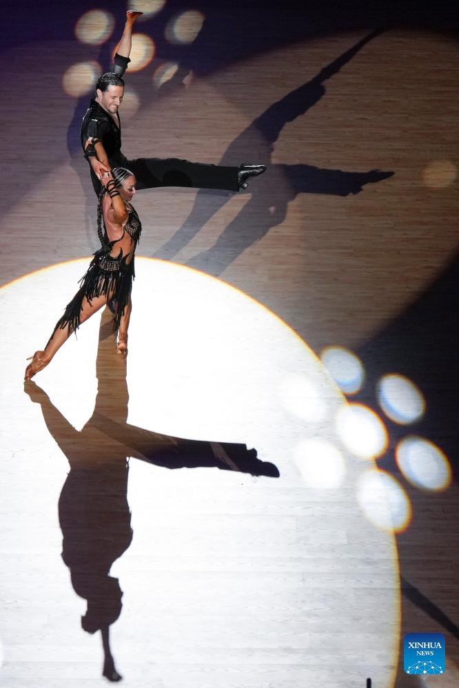 Marius Balan (R)/Khrystyna Moshenska of Germany compete during the Latin final match of Dancesport event at the World Games 2025 in Chengdu, southwest China's Sichuan Province, Aug. 8, 2025. (Xinhua/Li Bo)
