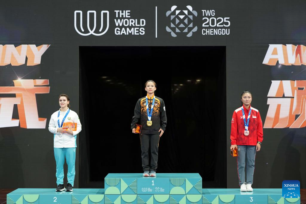 Gold medalist Tan Cheong Min (C) of Malaysia, silver medalist Darya Latisheva (L) of Uzbekistan and bronze medalist Kassandra Ong of Singapore attend the victory ceremony for the women's Nanquan-Nandao of Wushu event at The World Games 2025 in Chengdu, southwest China's Sichuan Province, Aug. 9, 2025. (Xinhua/Xu Suhui)