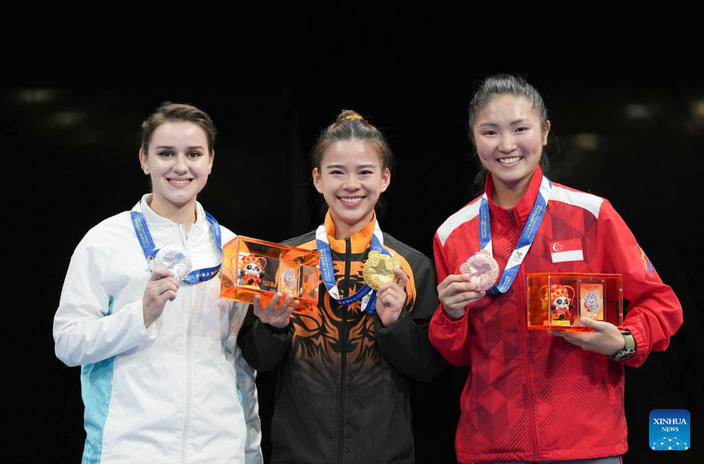 Gold medalist Tan Cheong Min (C) of Malaysia, silver medalist Darya Latisheva (L) of Uzbekistan and bronze medalist Kassandra Ong of Singapore pose during the victory ceremony for the women's Nanquan-Nandao of Wushu event at The World Games 2025 in Chengdu, southwest China's Sichuan Province, Aug. 9, 2025. (Xinhua/Xu Suhui)