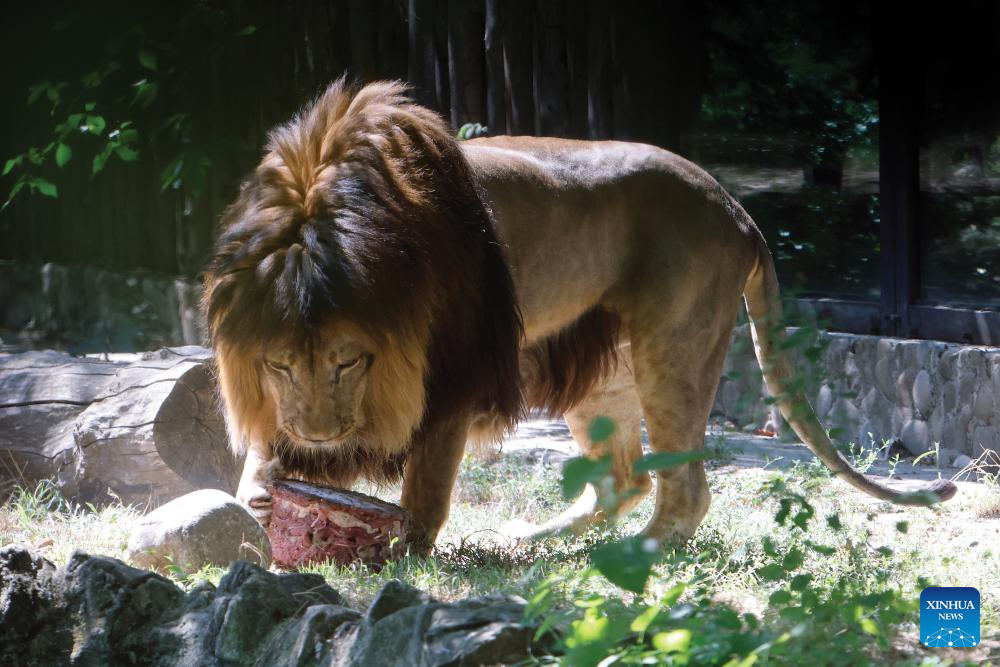 A lion enjoys its birthday cake during an event marking the World Lion Day at Bucharest Zoo in Bucharest, Romania, Aug. 9, 2025. World Lion Day is observed on Aug. 10 every year to raise people's awareness of lion conservation. (Photo by Cristian Cristel/Xinhua)