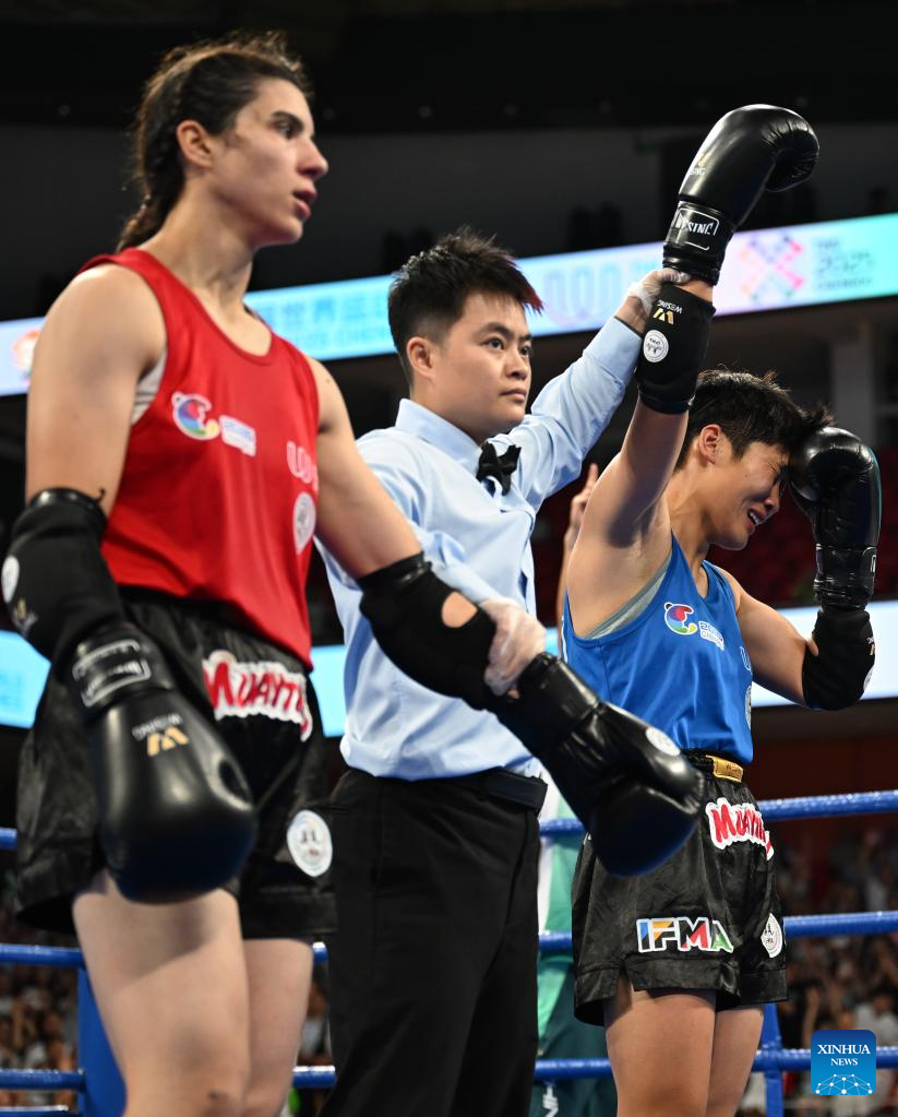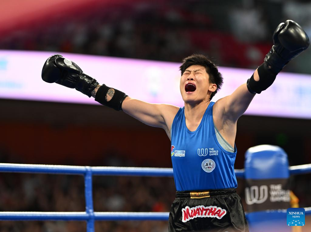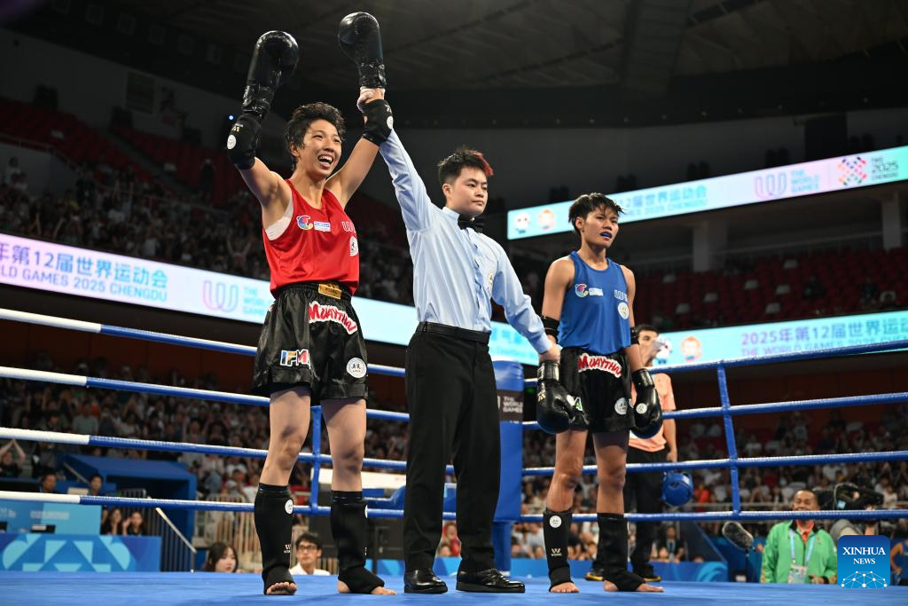 Han Xin celebrates after winning the women's -60kg finals gold medal bout between Han Xin of China and Kubra Kocakus of Türkiye of the Muaythai event at The World Games 2025 in Chengdu, southwest China's Sichuan Province, Aug. 10, 2025. (Xinhua/Zhang Bowen)