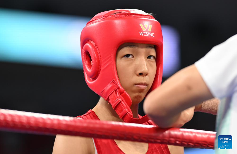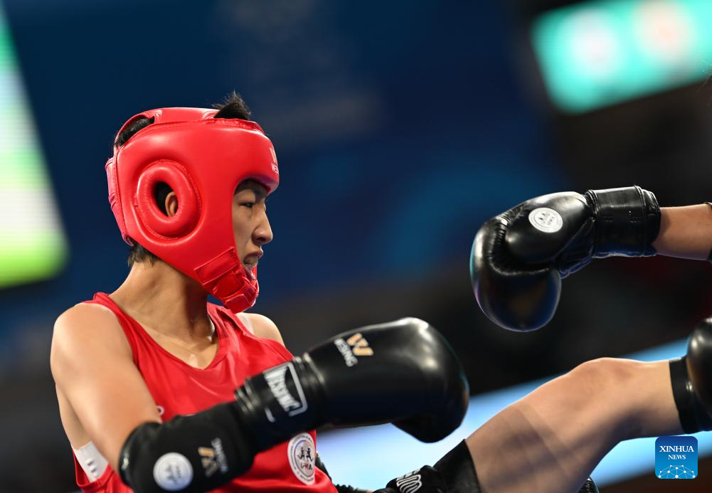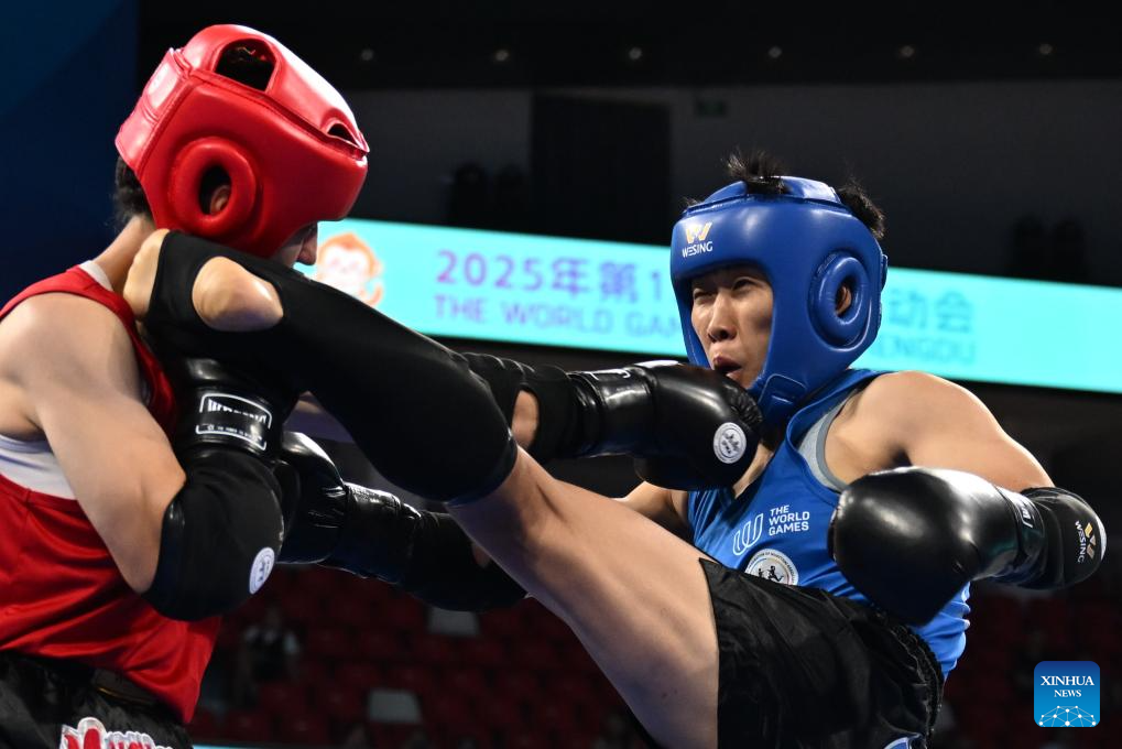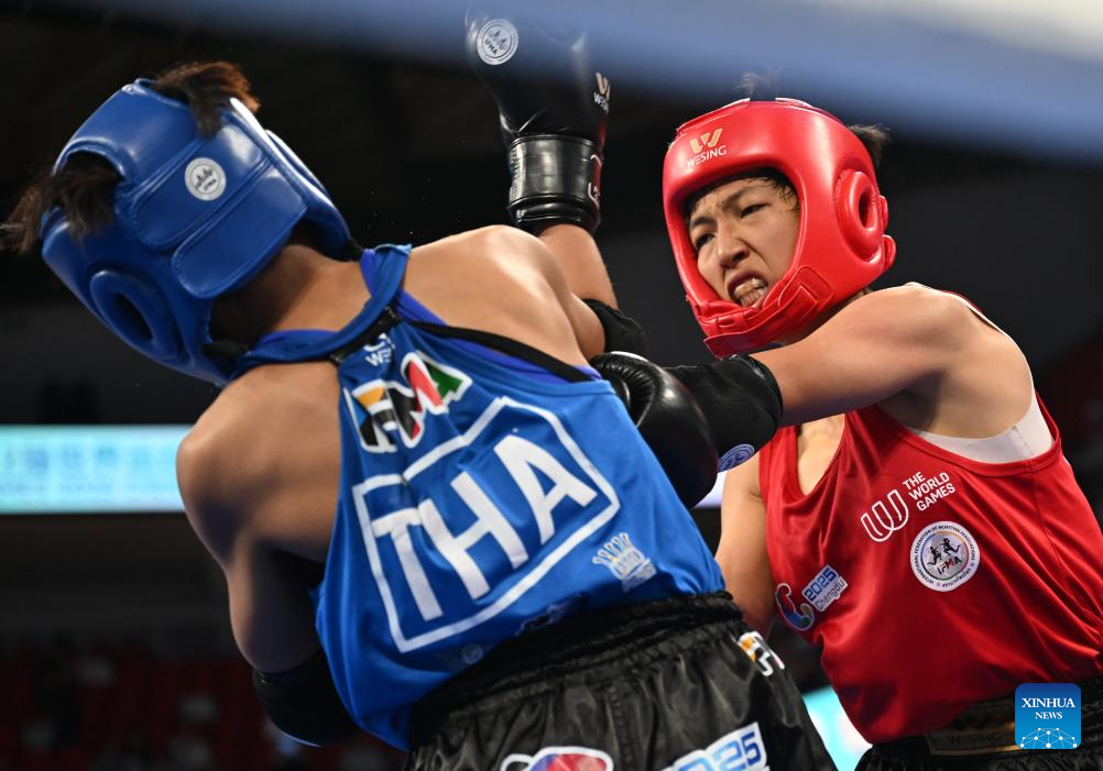 Liu Xiaohui competes during the women's -48kg finals gold medal bout between Liu Xiaohui of China and Miss Kullanat Aonok of Thailand of the Muaythai event at The World Games 2025 in Chengdu, southwest China's Sichuan Province, Aug. 10, 2025. (Xinhua/Zhang Bowen)