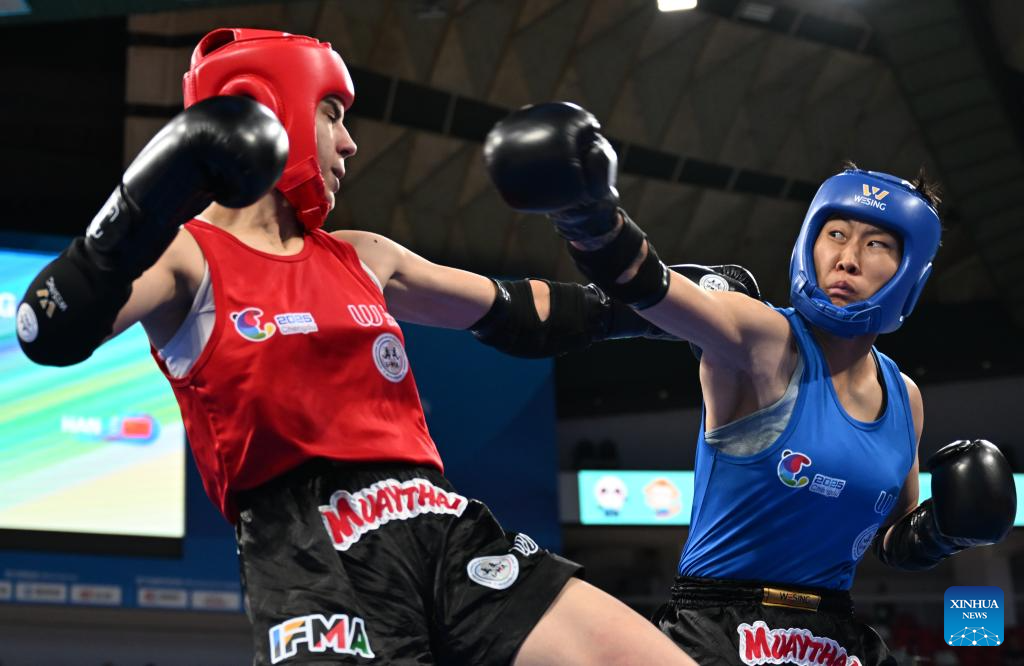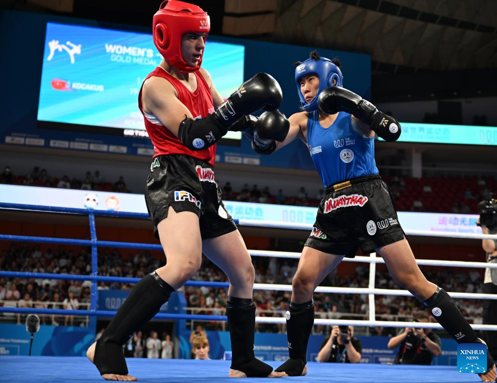 Han Xin (R) competes with Kubra Kocakus during the women's -60kg finals gold medal bout between Han Xin of China and Kubra Kocakus of Türkiye of the Muaythai event at The World Games 2025 in Chengdu, southwest China's Sichuan Province, Aug. 10, 2025. (Xinhua/Zhang Bowen)