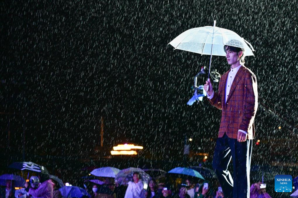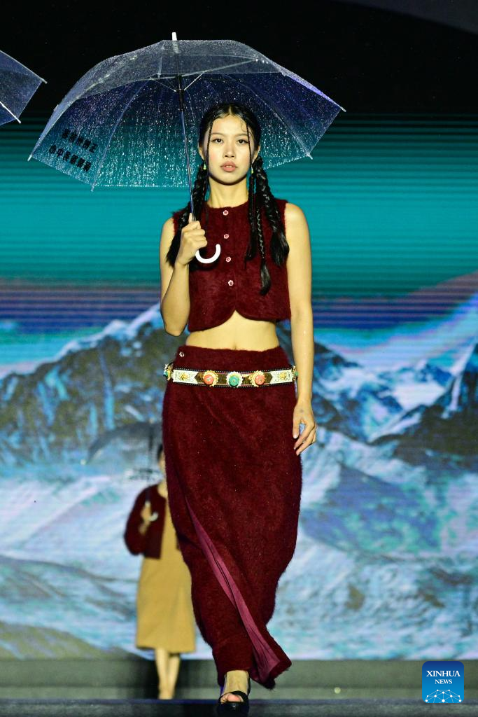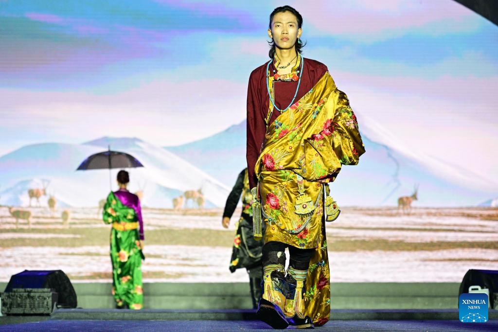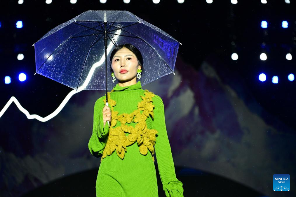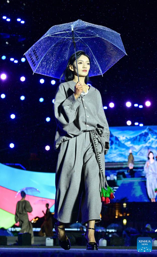 A model presents a creation at a fashion show in Yushu City of Yushu Tibetan Autonomous Prefecture, northwest China's Qinghai Province, Aug. 8, 2025. (Xinhua/Qi Zhiyue)