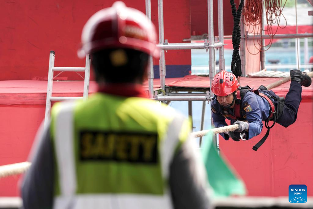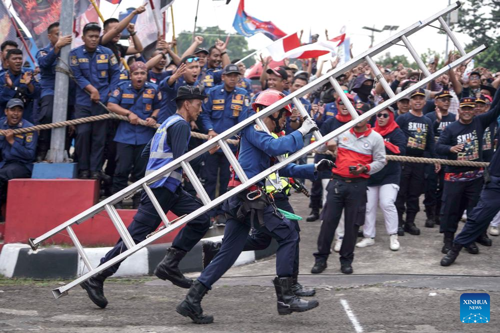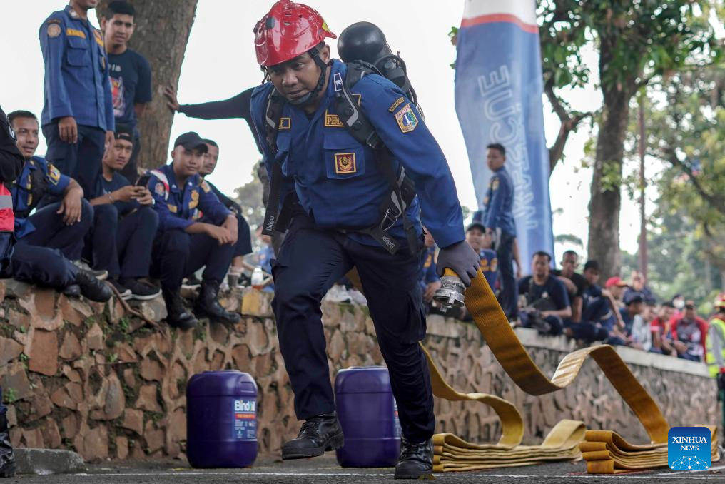 A firefighter participates in a competition at the Jakarta Fire Fighter Challenge (JFFC) 2025 in Jakarta, Indonesia, Aug. 11, 2025. (Photo by B. Nugraha/Xinhua)