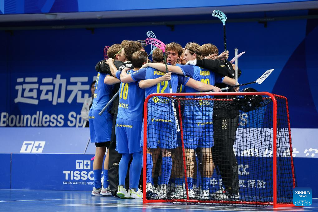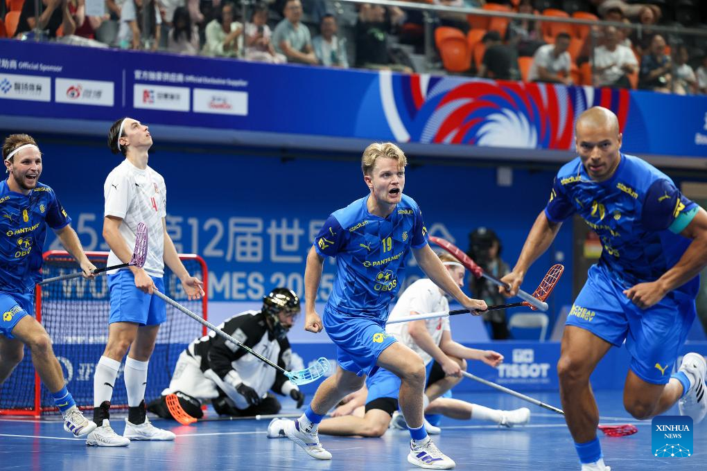 Players of team Sweden celebrate victory after the Men's Semifinal Match between Sweden and the Czech Republic of Floorball event at The World Games 2025 in Chengdu, southwest China's Sichuan Province, Aug. 11, 2025. (Xinhua/Liang Xu)