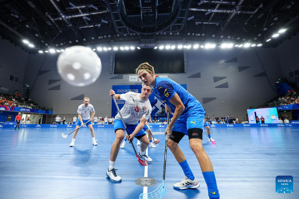 Linus Holmgren (1st R) of Sweden competes with Filip Langer of the Czech Republic during the Men's Semifinal Match of Floorball event at The World Games 2025 in Chengdu, southwest China's Sichuan Province, Aug. 11, 2025. (Xinhua/Liang Xu)