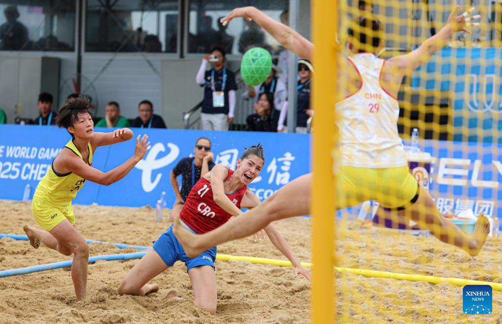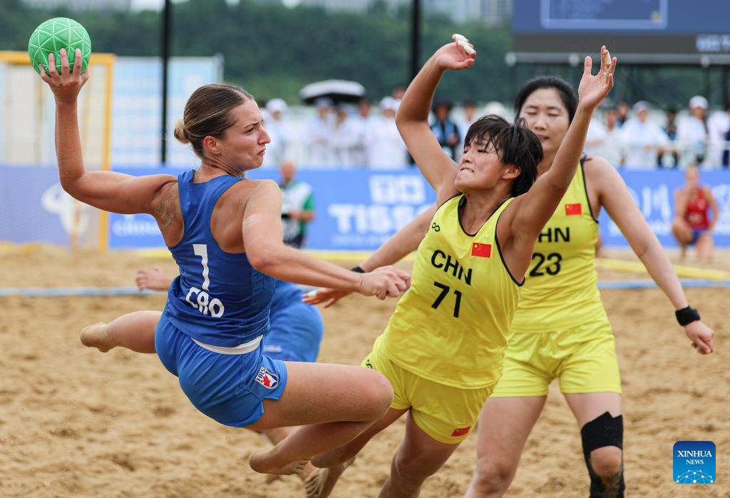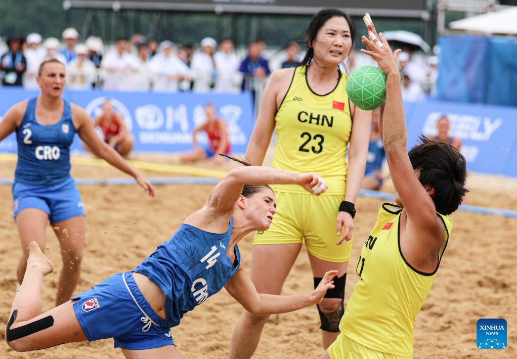Katja Hunjadi (C) of Croatia throws at goal during the women's Consolation Semifinals 5-8 match between China and Croatia of Beach Handball event at The World Games 2025 in Chengdu, southwest China's Sichuan Province, Aug. 11, 2025. (Xinhua/Liu Kun)