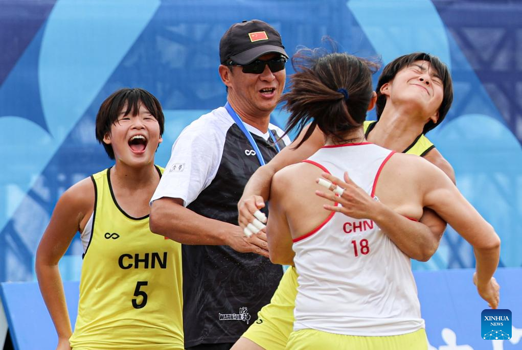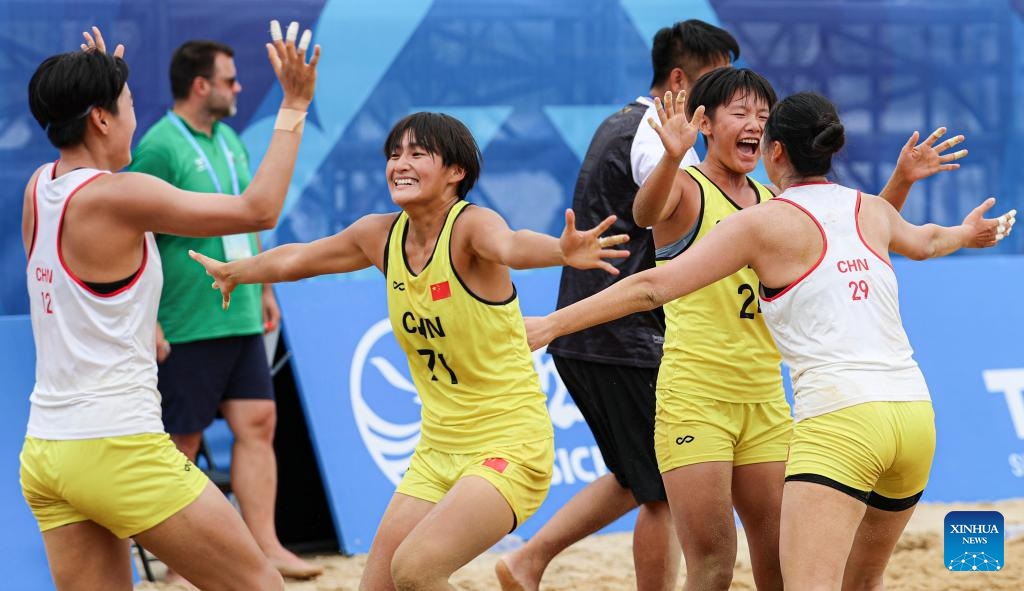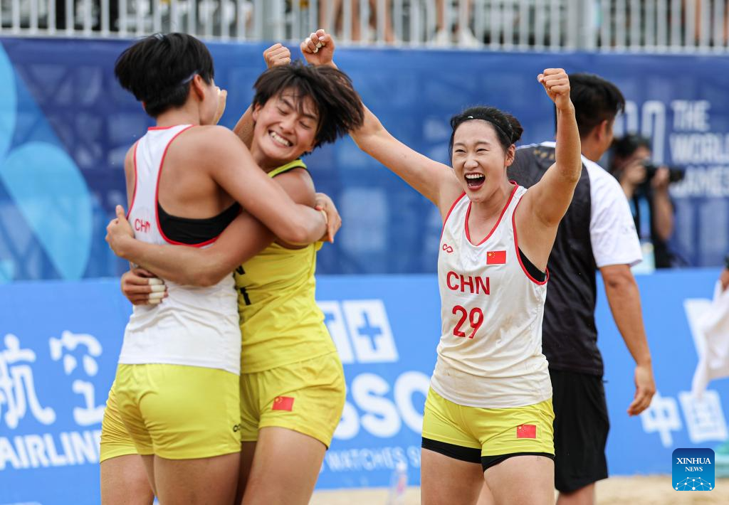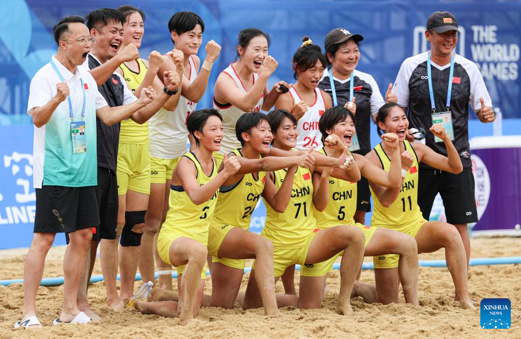 Players of team China celebrate after winning the women's Consolation Semifinals 5-8 match between China and Croatia of Beach Handball event at The World Games 2025 in Chengdu, southwest China's Sichuan Province, Aug. 11, 2025. (Xinhua/Liu Kun)