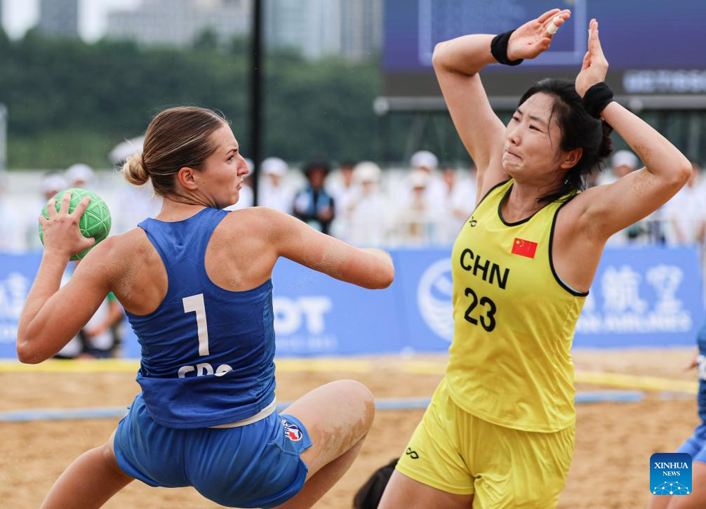Kristijana Lopac-Skrinjar (L) of Croatia throws at goal during the women's Consolation Semifinals 5-8 match between China and Croatia of Beach Handball event at The World Games 2025 in Chengdu, southwest China's Sichuan Province, Aug. 11, 2025. (Xinhua/Liu Kun)