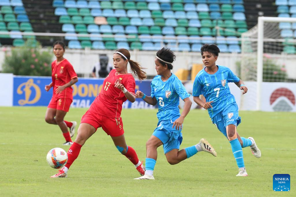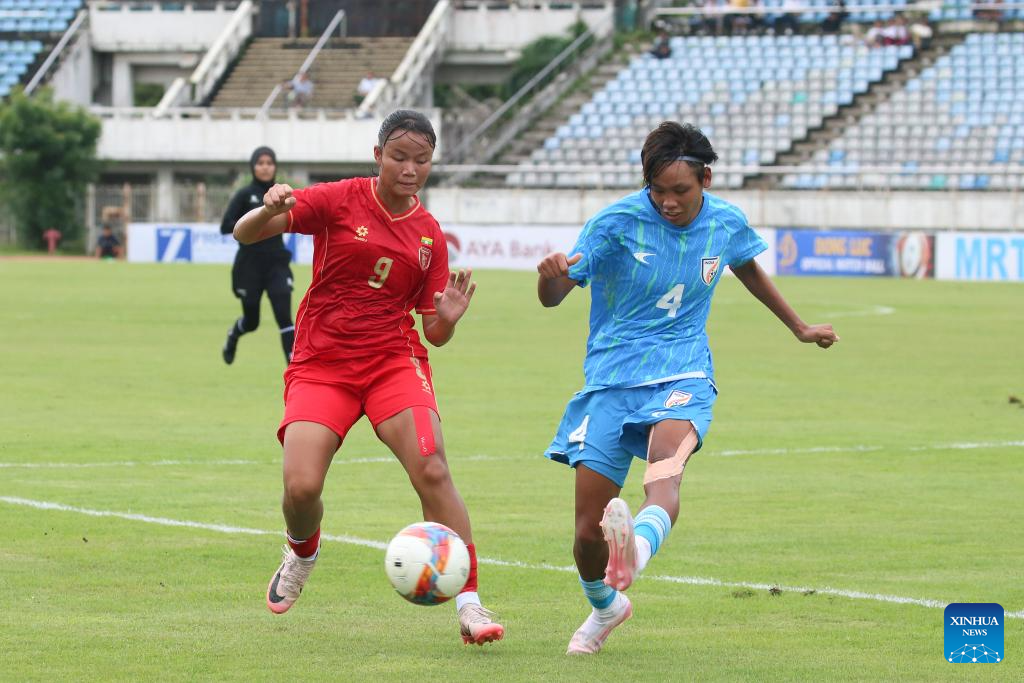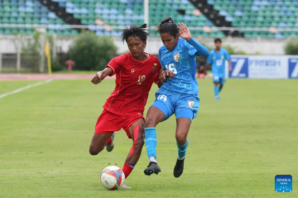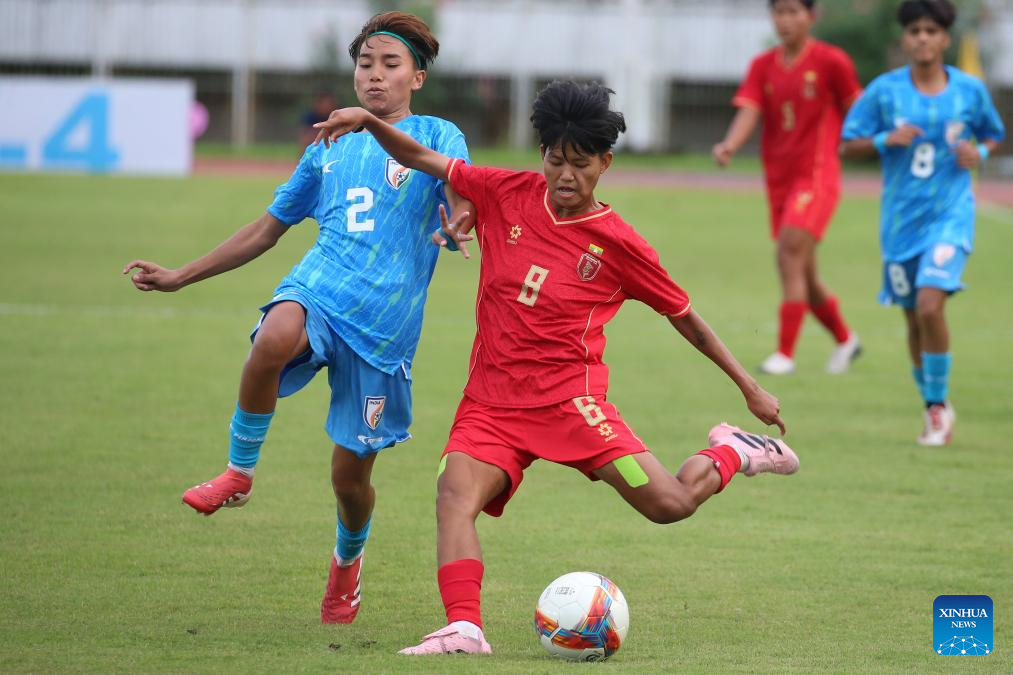 Myanmar's Win Sandar (front R) competes during the AFC U20 Women's Asian Cup 2026 qualifier between Myanmar and India in Yangon, Myanmar, Aug. 10, 2025. (Xinhua/Myo Kyaw Soe)