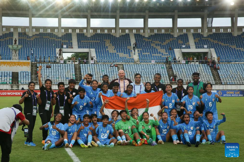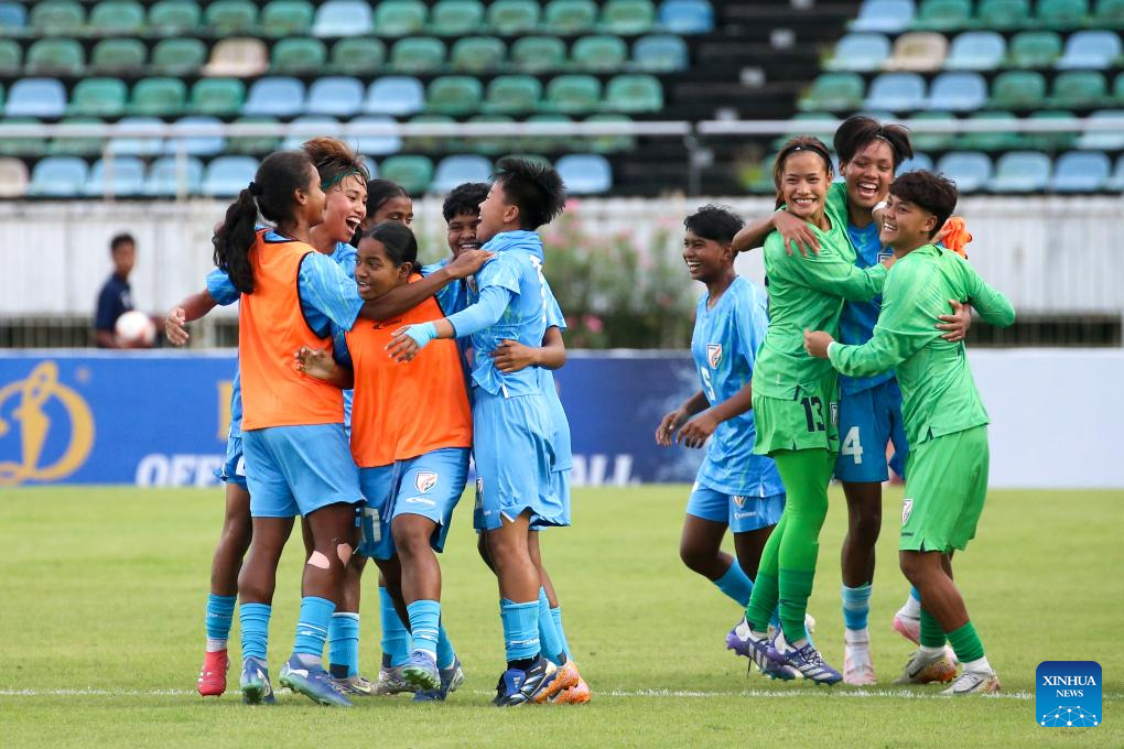 India's players celebrate after the AFC U20 Women's Asian Cup 2026 qualifier between Myanmar and India in Yangon, Myanmar, Aug. 10, 2025. (Xinhua/Myo Kyaw Soe)