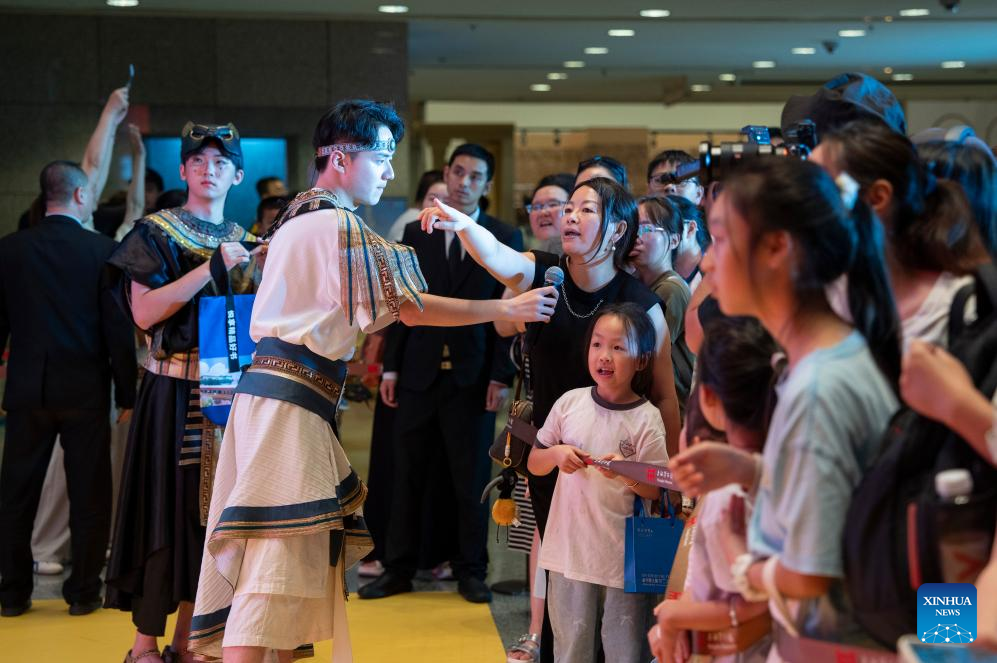 Visitors take part in an interactive game at the Shanghai Museum at night in Shanghai, east China, Aug. 11, 2025. The exhibition, titled "On Top of the Pyramid: The Civilization of Ancient Egypt," opens 24 hours a day from Aug. 11 to 17 at the Shanghai Museum. During the 168-hour carnival, there will also be new books releases, Egyptian dancing performances, interactive games and cultural and creative production promotions here. (Photo by Zhang Yue/Xinhua)