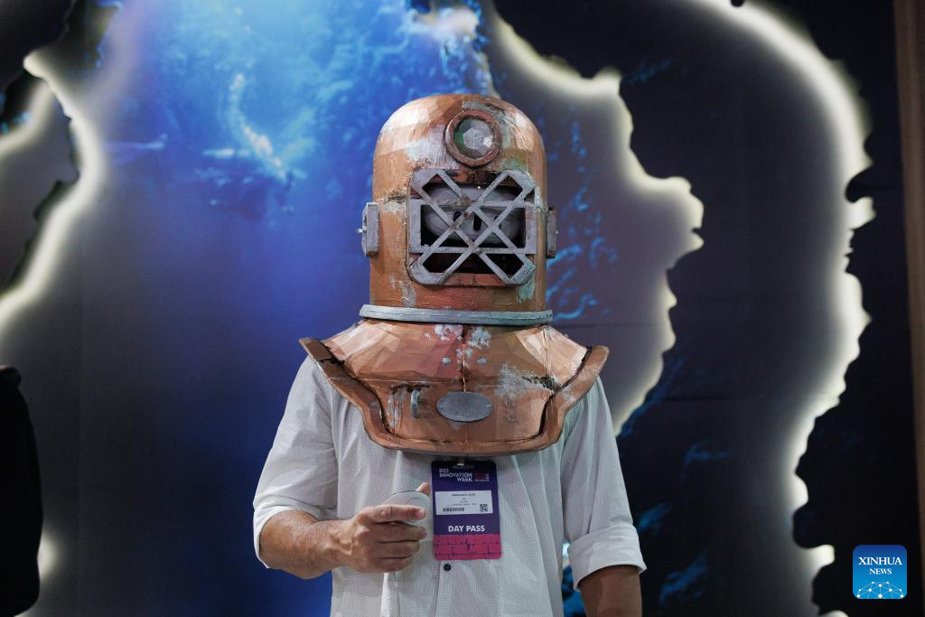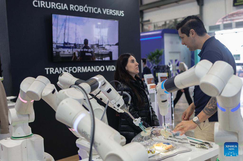 A visitor interacts with a demonstrator during a robotic surgery demonstration during Rio Innovation Week in Rio de Janeiro, Brazil, on Aug. 13, 2025. (Photo by Claudia Martini/Xinhua)