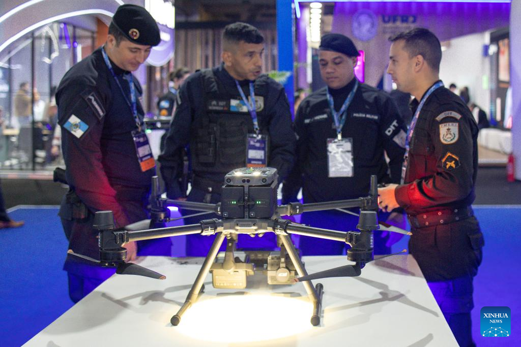 Visitors talk behind a police drone showcased during Rio Innovation Week in Rio de Janeiro, Brazil, on Aug. 13, 2025. (Photo by Claudia Martini/Xinhua)