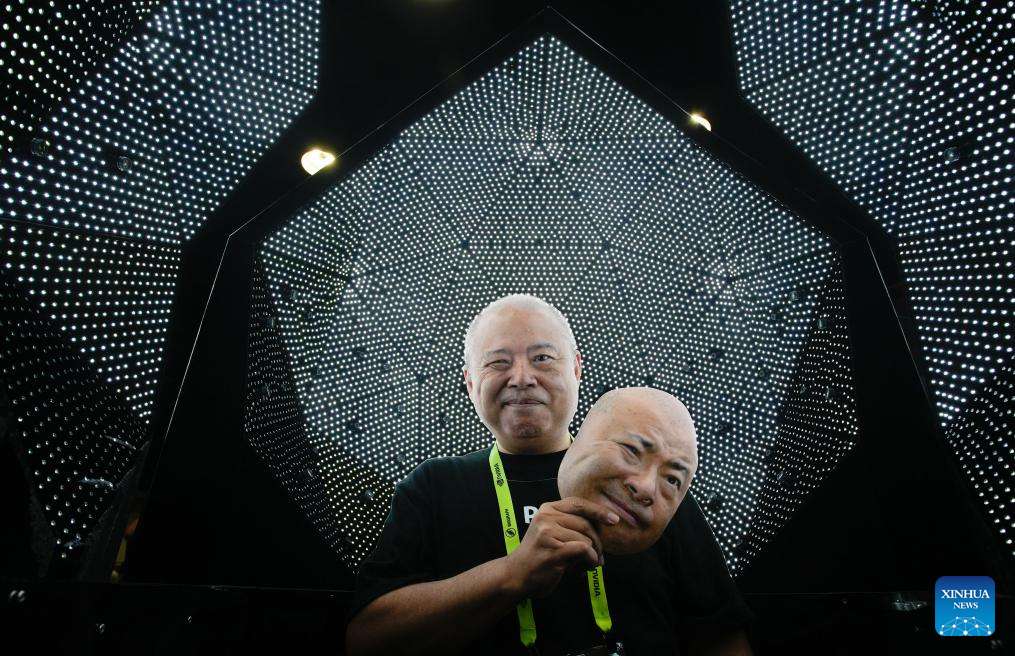 An exhibitor poses with his own 3D-printed face mask for a picture inside a 3D face-scanning machine during the Premier Conference & Exhibition on Computer Graphics & Interactive Techniques (SIGGRAPH 2025) at the Vancouver Convention Centre in Vancouver, Canada, Aug. 12, 2025. (Photo by Liang Sen/Xinhua)