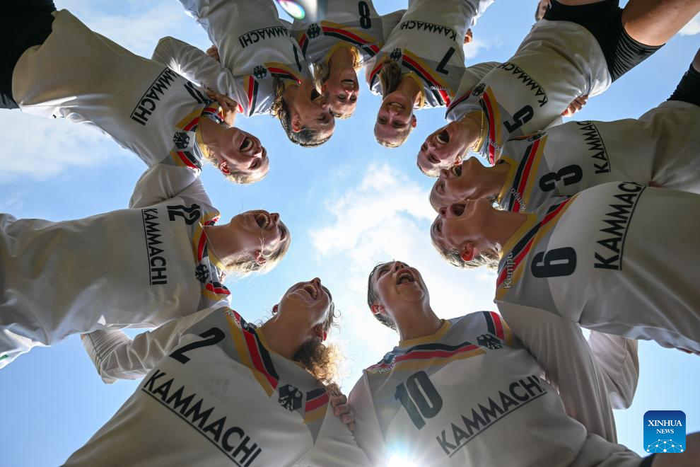 Players of Germany celebrate after winning the Fistball Women's Bronze Medal Match between Austria and Germany at The World Games 2025 in Chengdu, southwest China's Sichuan Province, Aug. 13, 2025. (Xinhua/Chen Cheng)