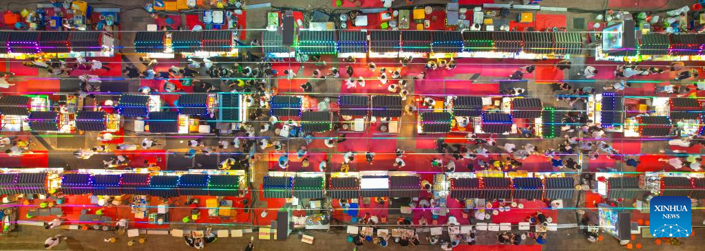 An aerial drone photo taken on Aug. 12, 2025 shows a night market in Qingdao, east China's Shandong Province. (Photo by Zhang Ying/Xinhua)