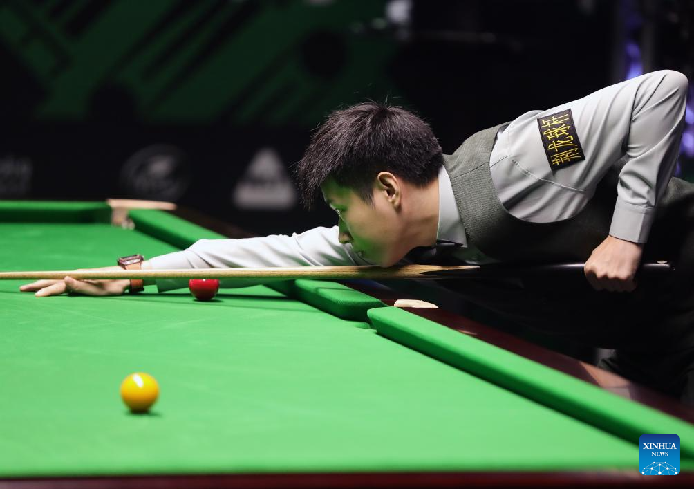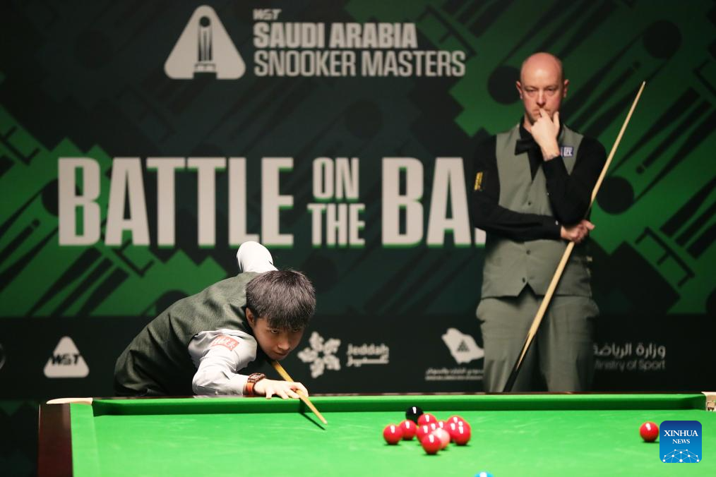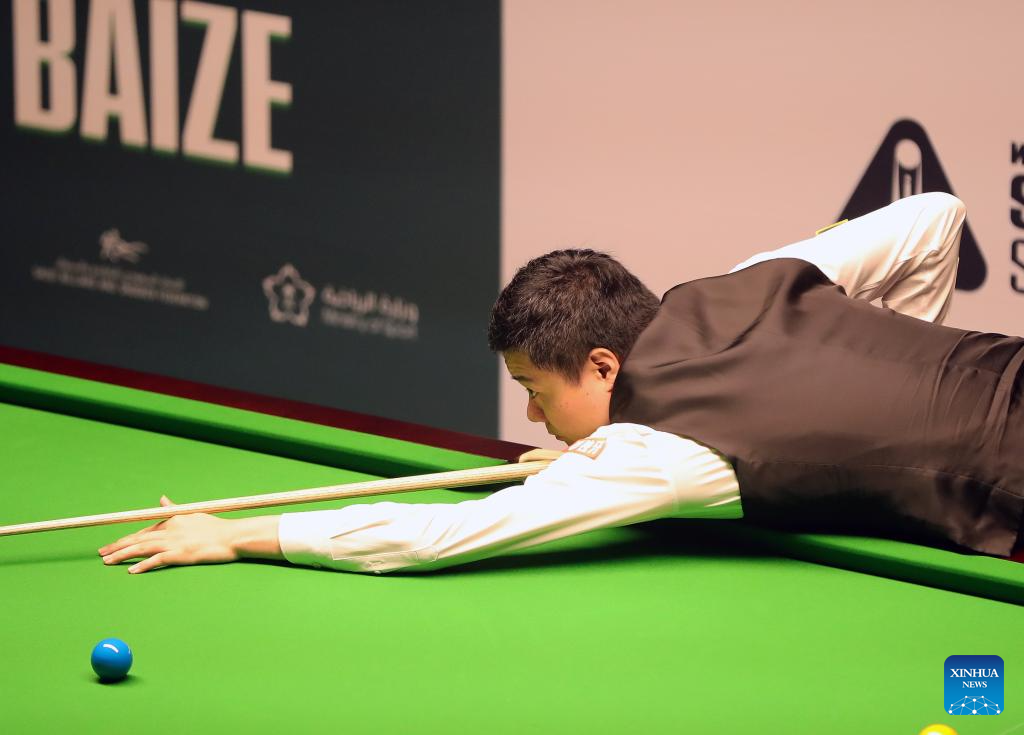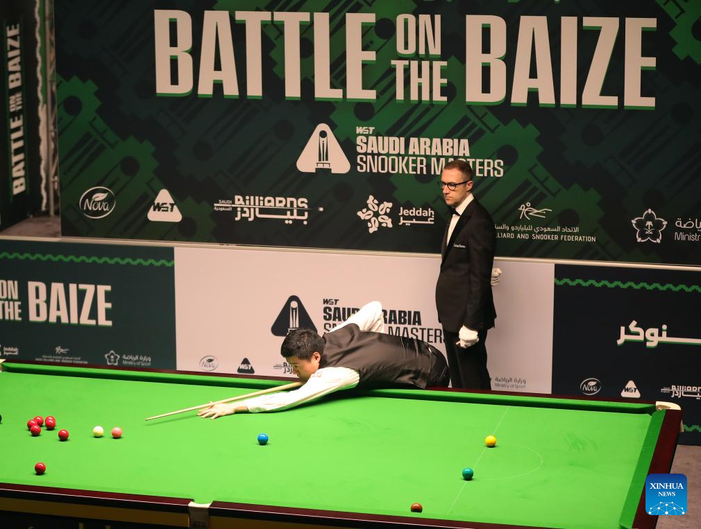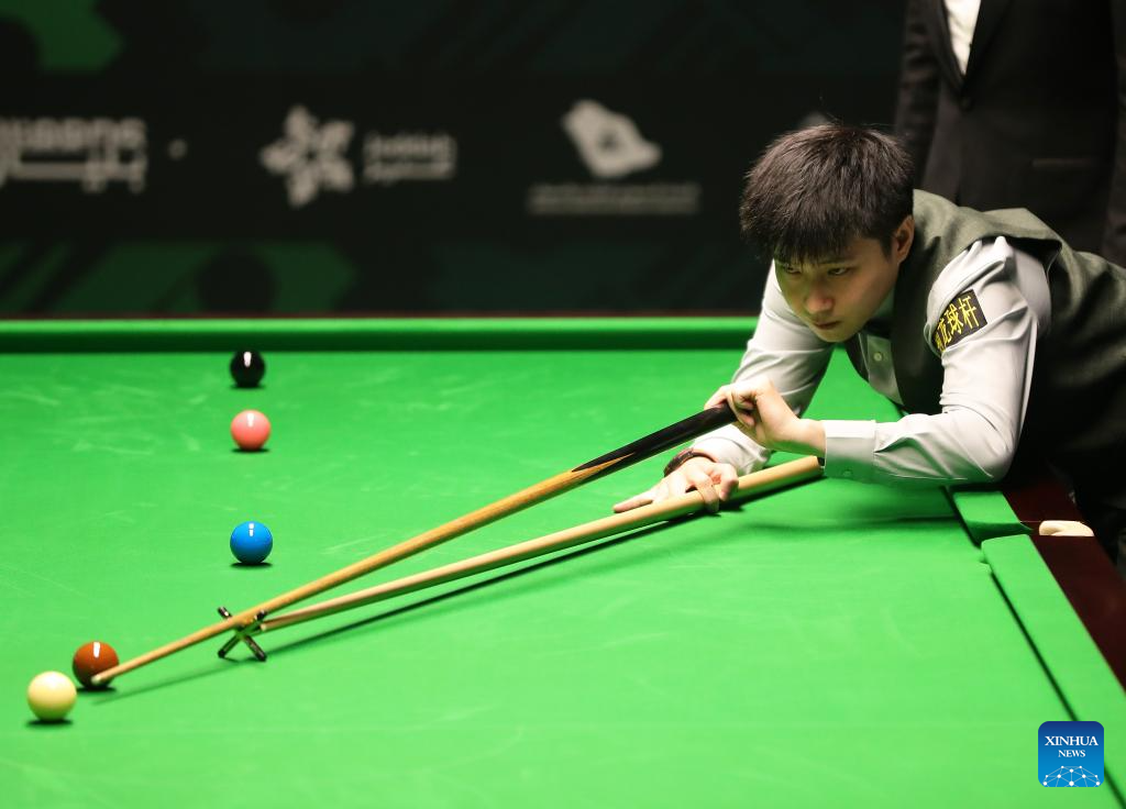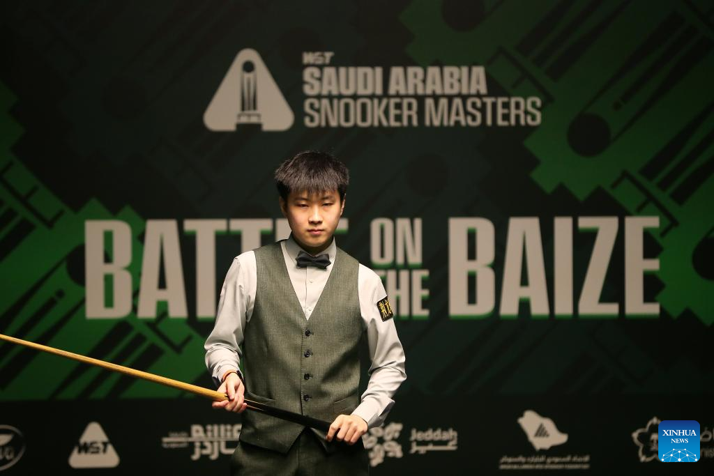 Chang Bingyu of China competes during the round 6 match against Ronnie O'Sullivan of England at the Saudi Arabia Snooker Masters 2025 in Jeddah, Saudi Arabia, Aug. 13, 2025. (Xinhua/Wang Dongzhen)