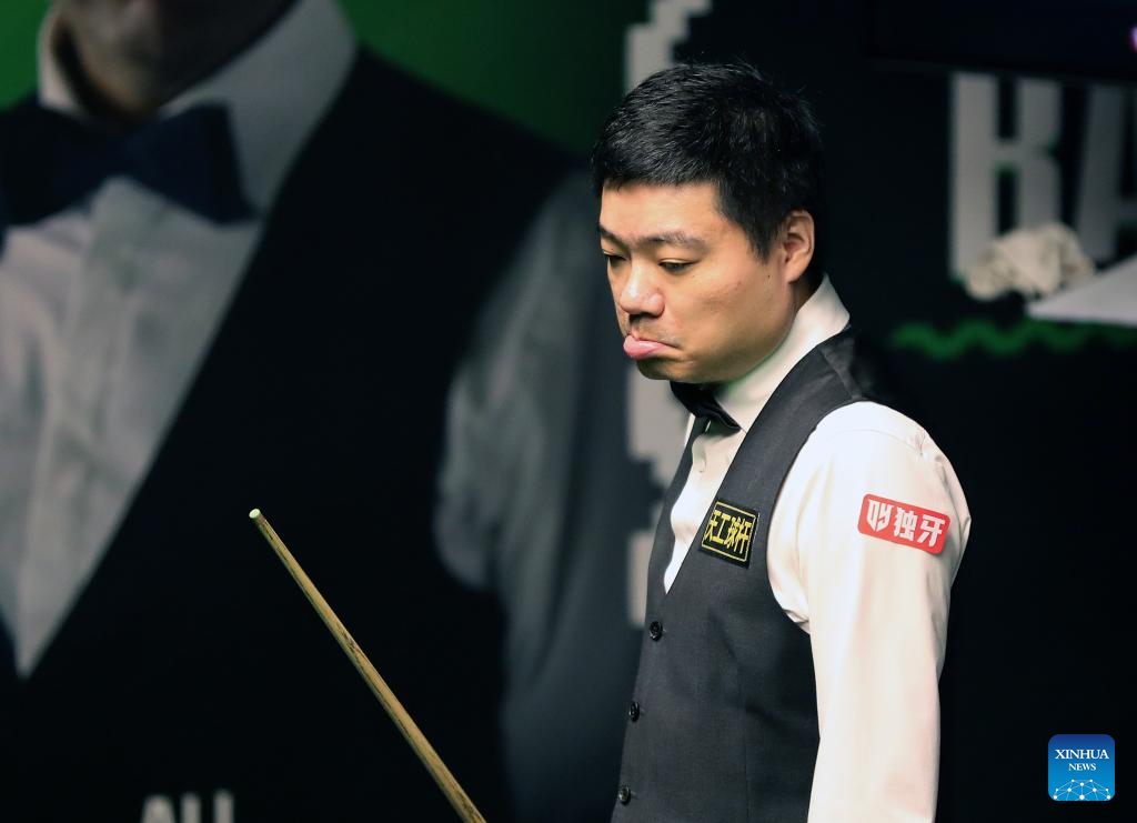 Ding Junhui of China competes during the round 6 match against Barry Hawkins of England at the Saudi Arabia Snooker Masters 2025 in Jeddah, Saudi Arabia, Aug. 13, 2025. (Xinhua/Wang Dongzhen)