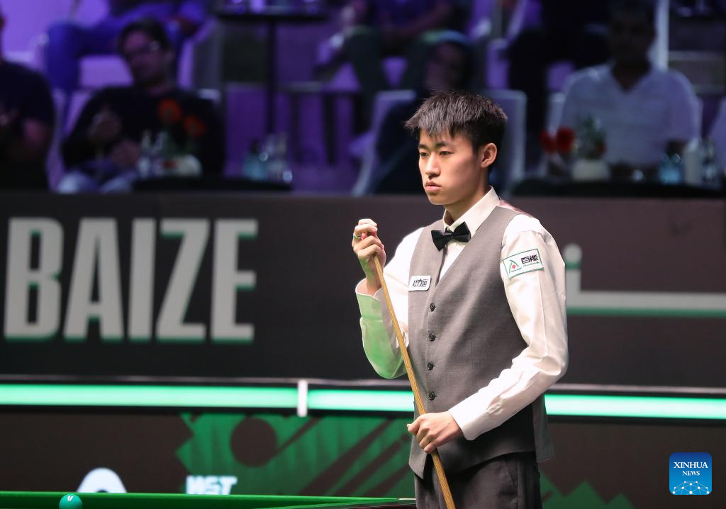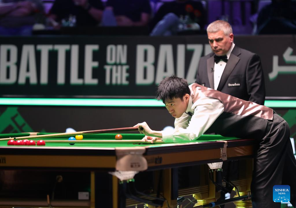 Zhao Xintong of China competes during the round 6 match against Chris Wakelin of England at the Saudi Arabia Snooker Masters 2025 in Jeddah, Saudi Arabia, Aug. 13, 2025. (Xinhua/Wang Dongzhen)
