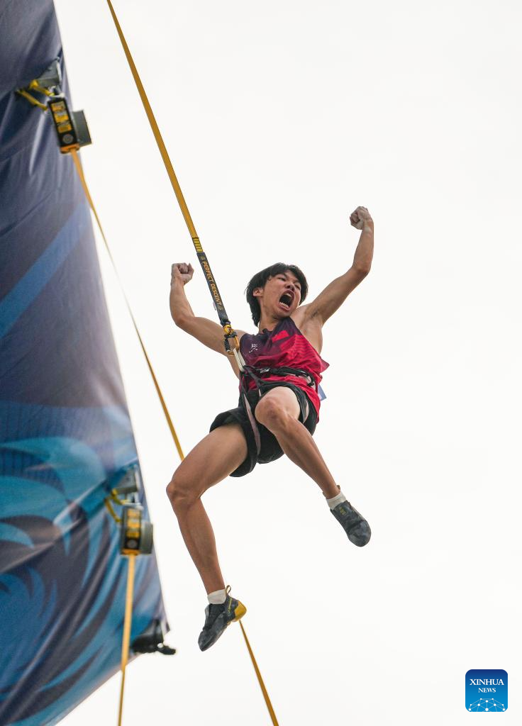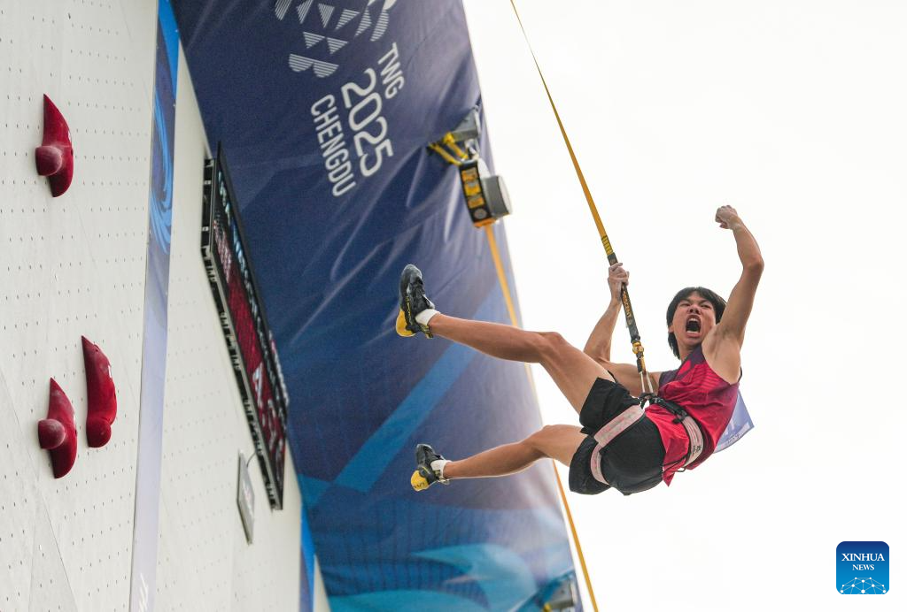Chu Shouhong of China celebrates after defeating Samuel Ryan Watson of the United States during the Sport Climbing Men's Speed Single Finals Gold Medal Final at The World Games 2025 in Chengdu, southwest China's Sichuan Province, Aug. 14, 2025. (Xinhua/Tenzin Nyida)
