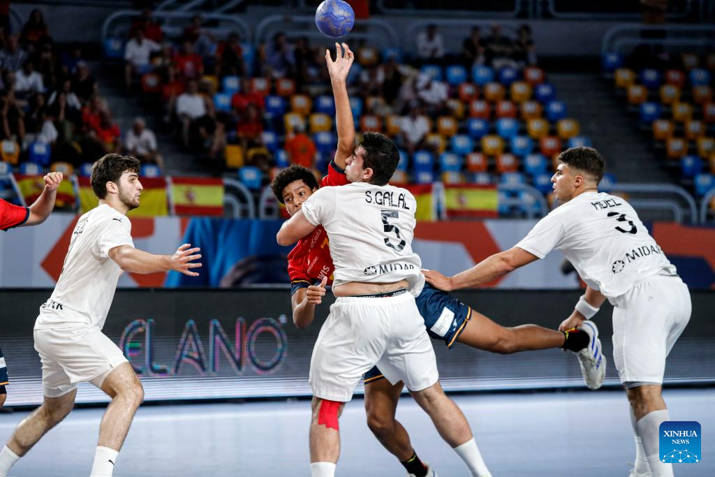 Anselmo Collado Carrion (C) of Spain shoots during the quarterfinal handball match between Spain and Egypt at the 11th IHF Men's Youth World Championship 2025 in Cairo, Egypt, on Aug. 14, 2025. (Xinhua/Ahmed Gomaa)