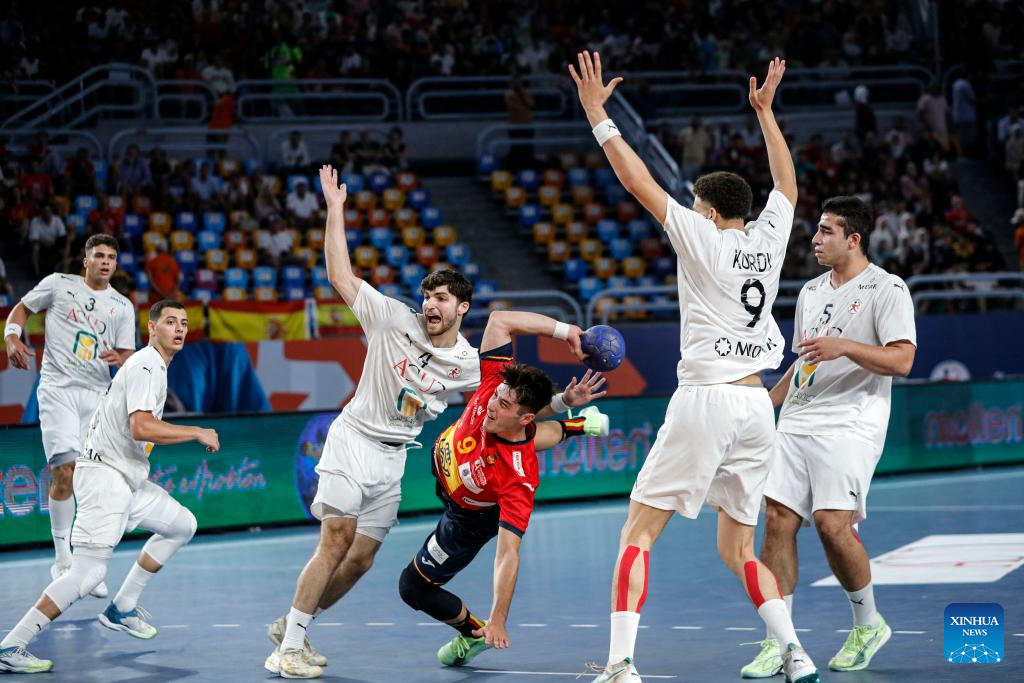 Marcos Fis Ballester (2nd L) of Spain shoots during the quarterfinal handball match between Spain and Egypt at the 11th IHF Men's Youth World Championship 2025 in Cairo, Egypt, on Aug. 14, 2025. (Xinhua/Ahmed Gomaa)