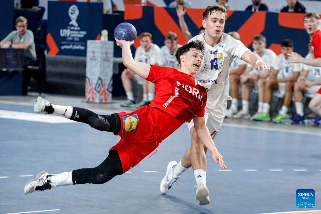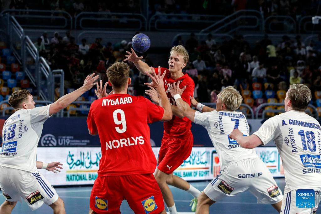 Dagur Arni Heimisson (C) of Iceland competes during the quarterfinal handball match between Denmark and Iceland at the 11th IHF Men's Youth World Championship 2025 in Cairo, Egypt, on Aug. 14, 2025. (Xinhua/Ahmed Gomaa)