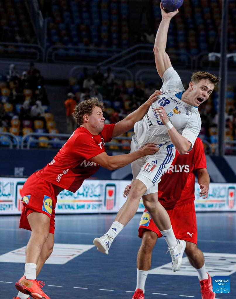Magnus Boysen Moldrup (front) of Denmark shoots during the quarterfinal handball match between Denmark and Iceland at the 11th IHF Men's Youth World Championship 2025 in Cairo, Egypt, on Aug. 14, 2025. (Xinhua/Ahmed Gomaa)