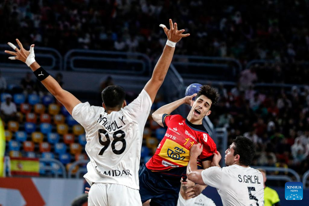 Miguel Angel Martin Duque (R) of Spain shoots during the quarterfinal handball match between Spain and Egypt at the 11th IHF Men's Youth World Championship 2025 in Cairo, Egypt, on Aug. 14, 2025. (Xinhua/Ahmed Gomaa)