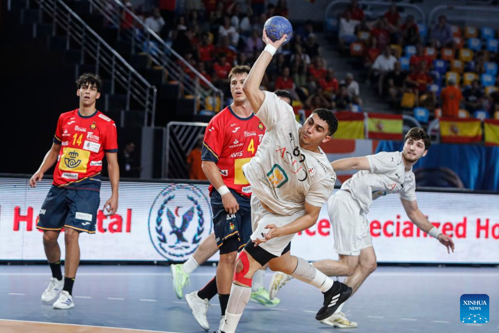 Mohamed Shalaby (2nd R) of Egypt shoots during the quarterfinal handball match between Spain and Egypt at the 11th IHF Men's Youth World Championship 2025 in Cairo, Egypt, on Aug. 14, 2025. (Xinhua/Ahmed Gomaa)