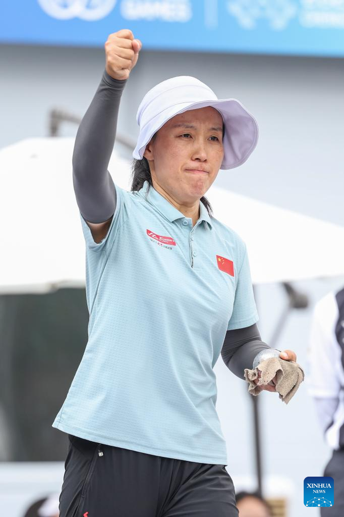 Yan Linlin of China reacts during the Boules Sports Women's Petanque Precision Shooting Gold Medal Match against Mouna Beji Ep Mattoussi of Tunisia at The World Games 2025 in Chengdu, southwest China's Sichuan Province, Aug. 16, 2025. (Xinhua/Zhang Liyun)