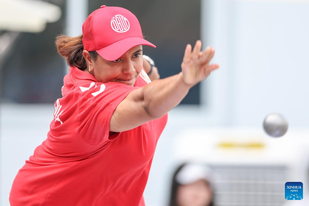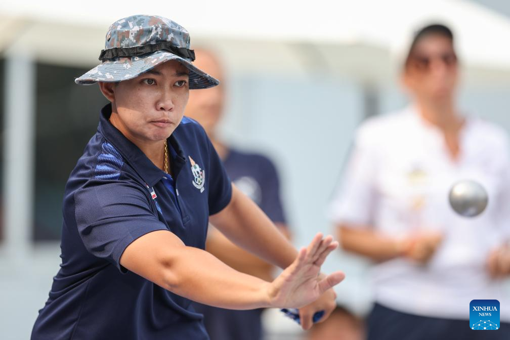 Nantawan Fueangsanit of Thailand competes during the Boules Sports Women's Petanque Precision Shooting Bronze Medal Match against Sandrine Poinsot of France at The World Games 2025 in Chengdu, southwest China's Sichuan Province, Aug. 16, 2025. (Xinhua/Zhang Liyun)