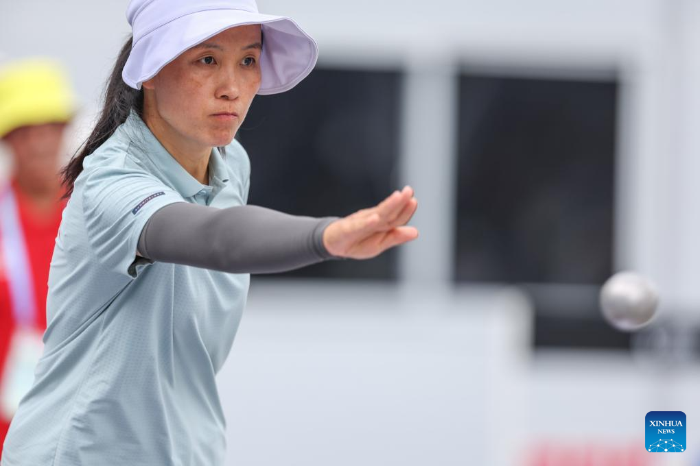 Yan Linlin of China competes during the Boules Sports Women's Petanque Precision Shooting Gold Medal Match against Mouna Beji Ep Mattoussi of Tunisia at The World Games 2025 in Chengdu, southwest China's Sichuan Province, Aug. 16, 2025. (Xinhua/Zhang Liyun)