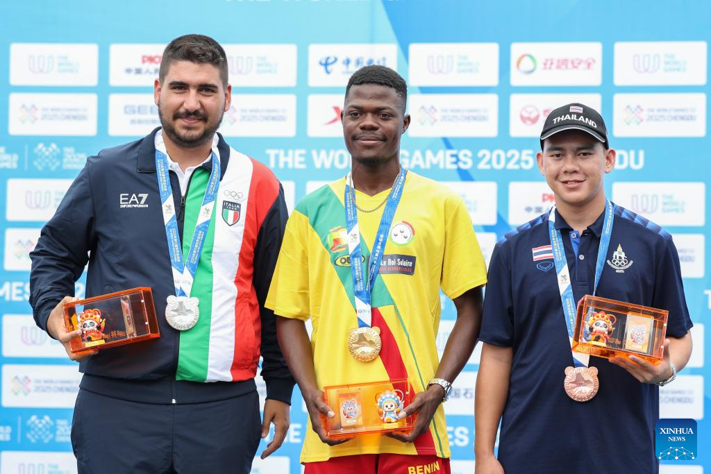 Gold medalist Marcel Gbetable (C) of Benin, silver medalist Andrea Chiapello (L) of Italy and bronze medalist Ratchata Khamdee of Thailand pose during the victory ceremony for the Boules Sports Men's Petanque Precision Shooting event at The World Games 2025 in Chengdu, southwest China's Sichuan Province, Aug. 16, 2025. (Xinhua/Zhang Liyun)