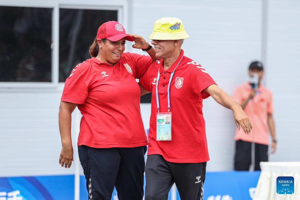 Mouna Beji Ep Mattoussi (L) of Tunisia celebrates with her coach after winning the Boules Sports Women's Petanque Precision Shooting Gold Medal Match against Yan Linlin of China at The World Games 2025 in Chengdu, southwest China's Sichuan Province, Aug. 16, 2025. (Xinhua/Zhang Liyun)